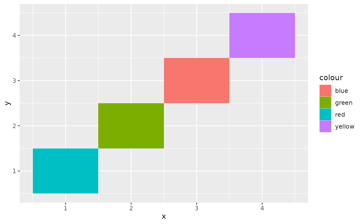 ggplot(df, aes(x, y)) + geom_tile(aes(fill = colour))