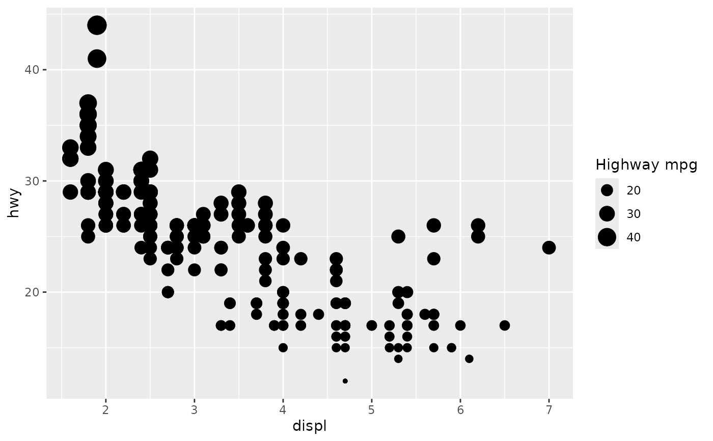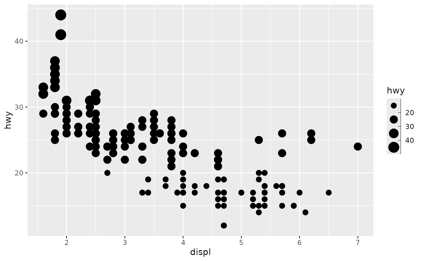 p <- ggplot(mpg, aes(displ, hwy, size = hwy)) +