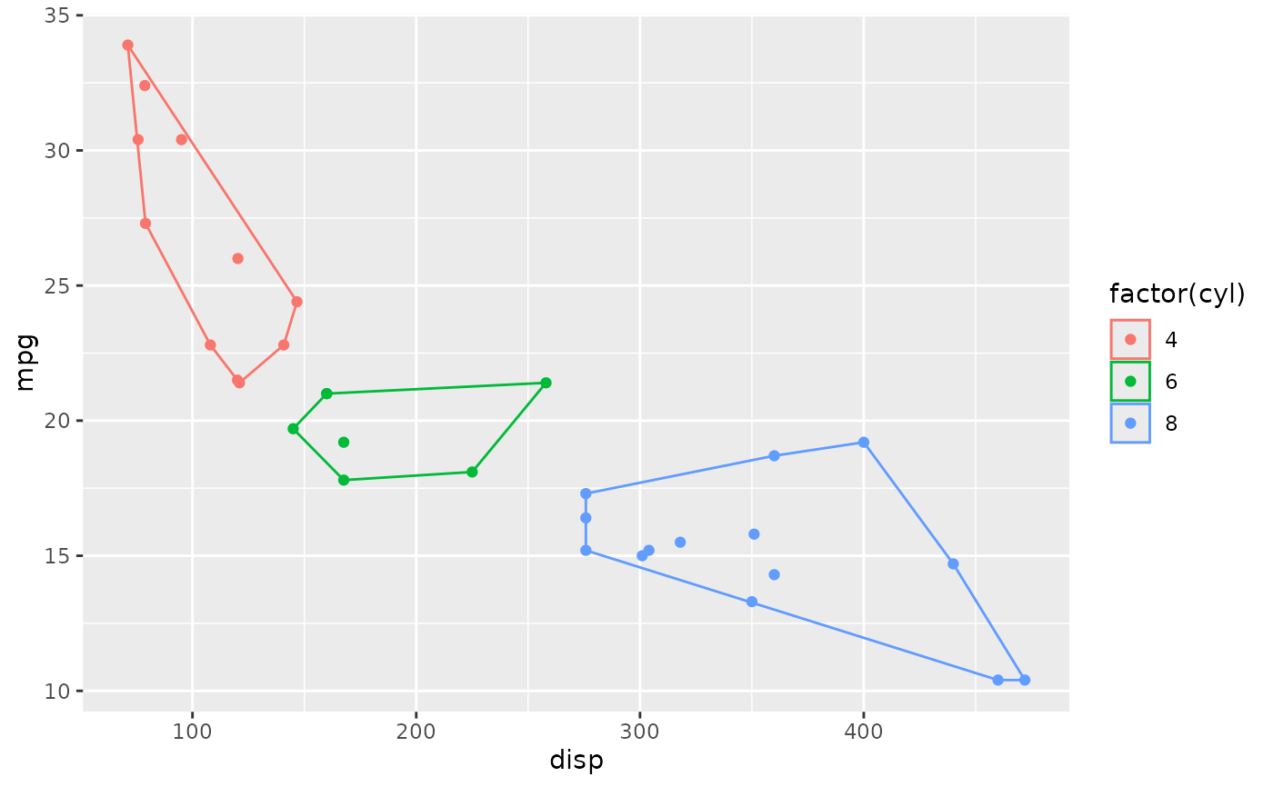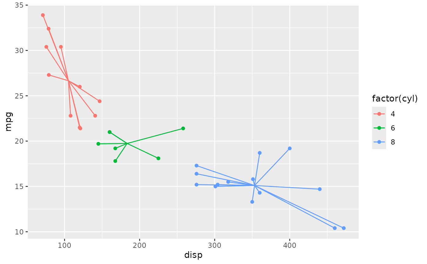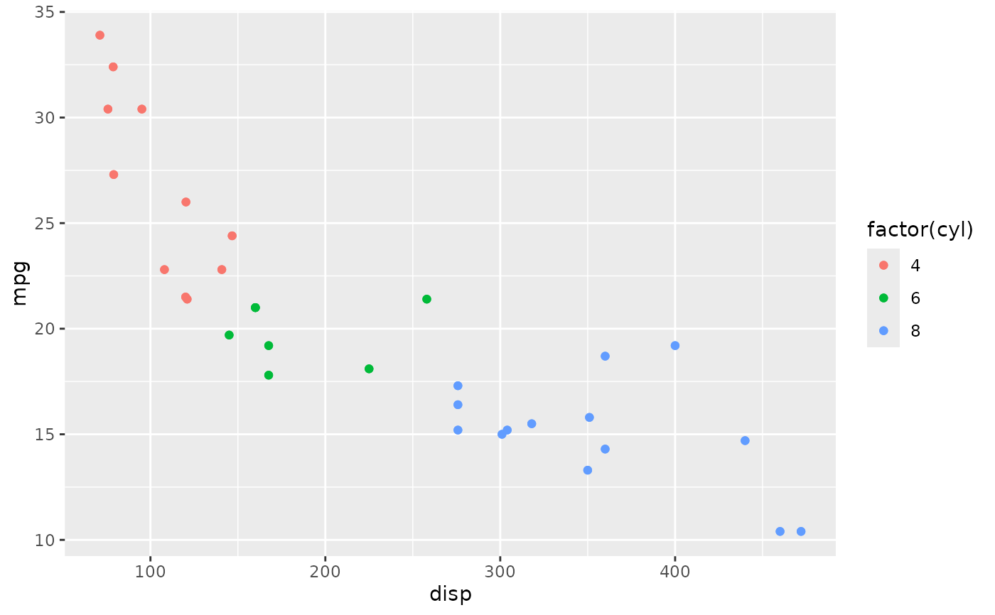 p <- ggplot(mtcars, aes(disp, mpg, colour = factor(cyl))) +