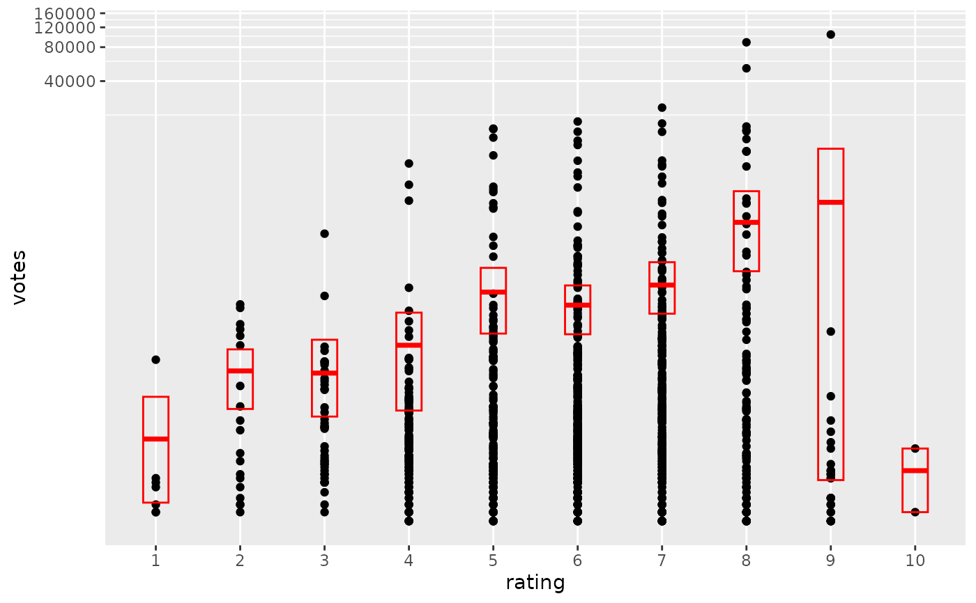 ggplot(mov, aes(x = factor(round(rating)), y = votes)) +