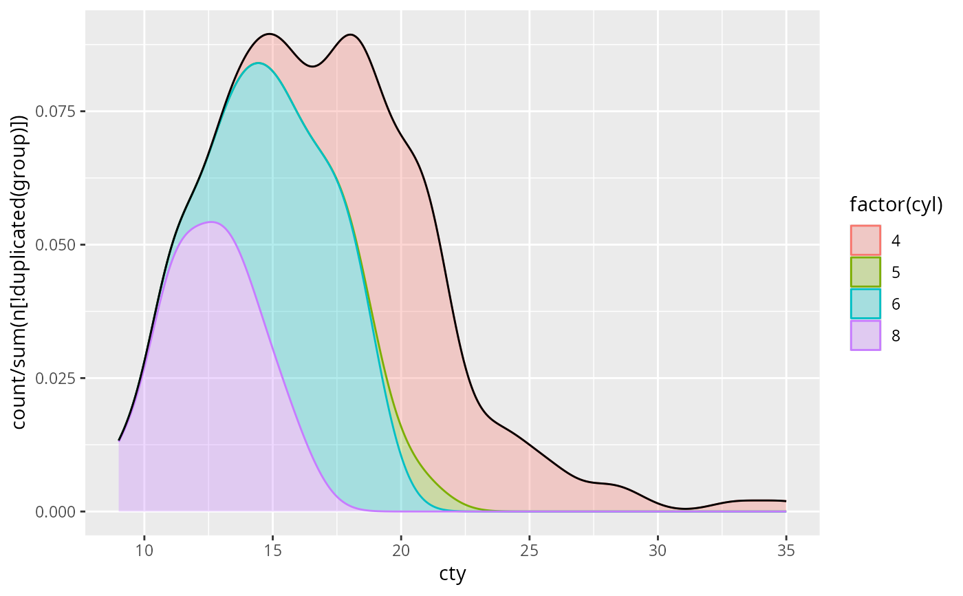 ggplot(mpg, aes(cty, colour = factor(cyl))) +