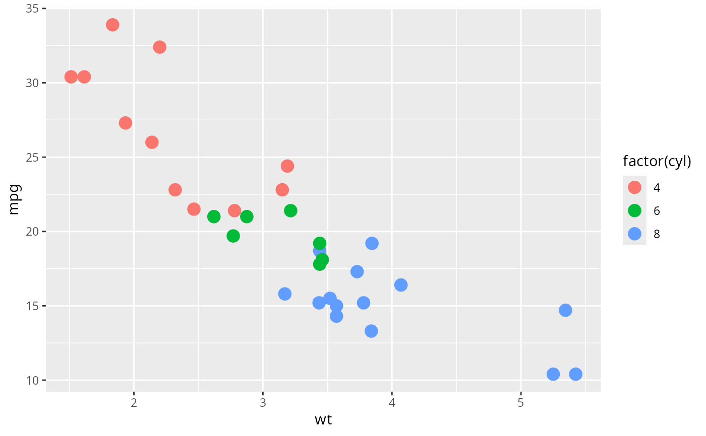 p + geom_point(aes(colour = factor(cyl)), size = 4)