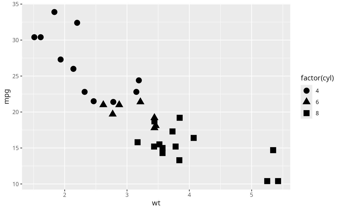 p + geom_point(aes(shape = factor(cyl)), size = 4)
