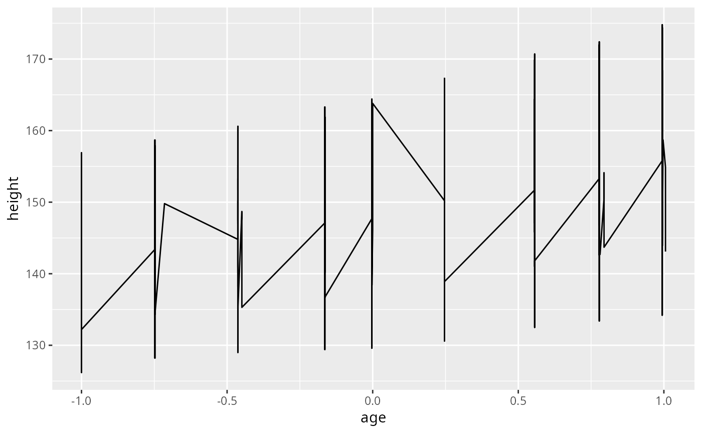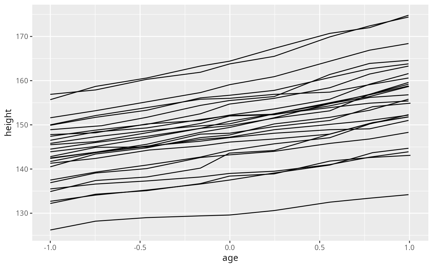p <- ggplot(nlme::Oxboys, aes(age, height))