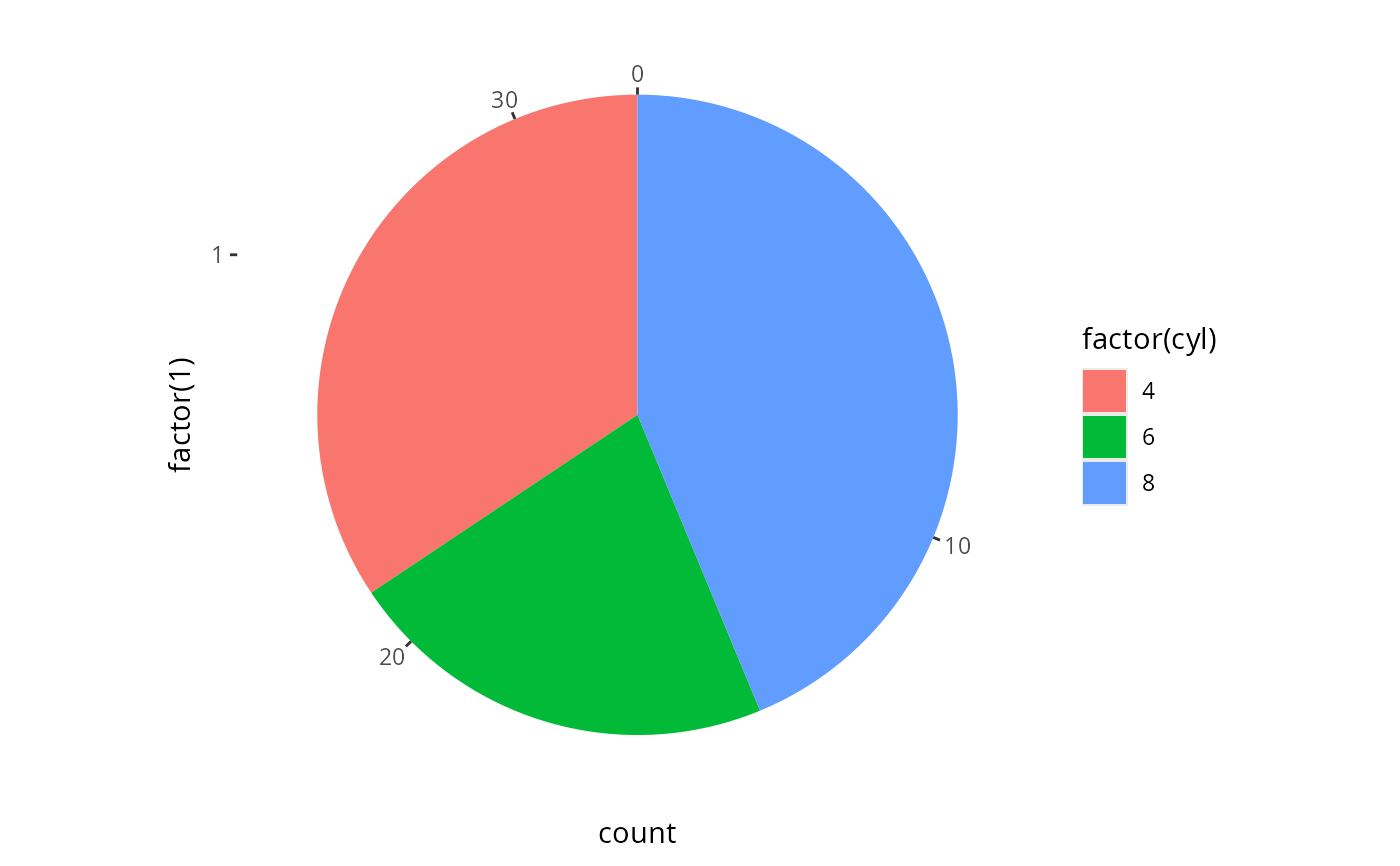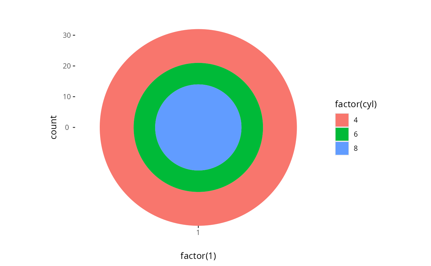 pie <- ggplot(mtcars, aes(x = factor(1), fill = factor(cyl))) +