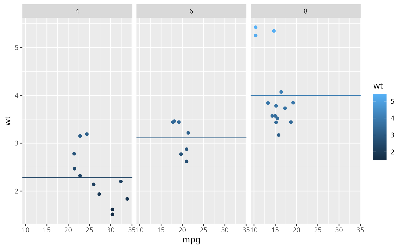 geom_hline(aes(yintercept = wt, colour = wt), mean_wt) +