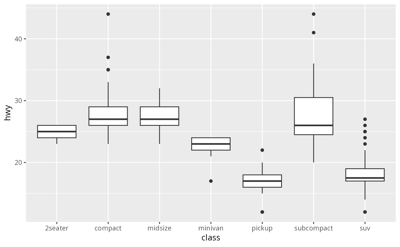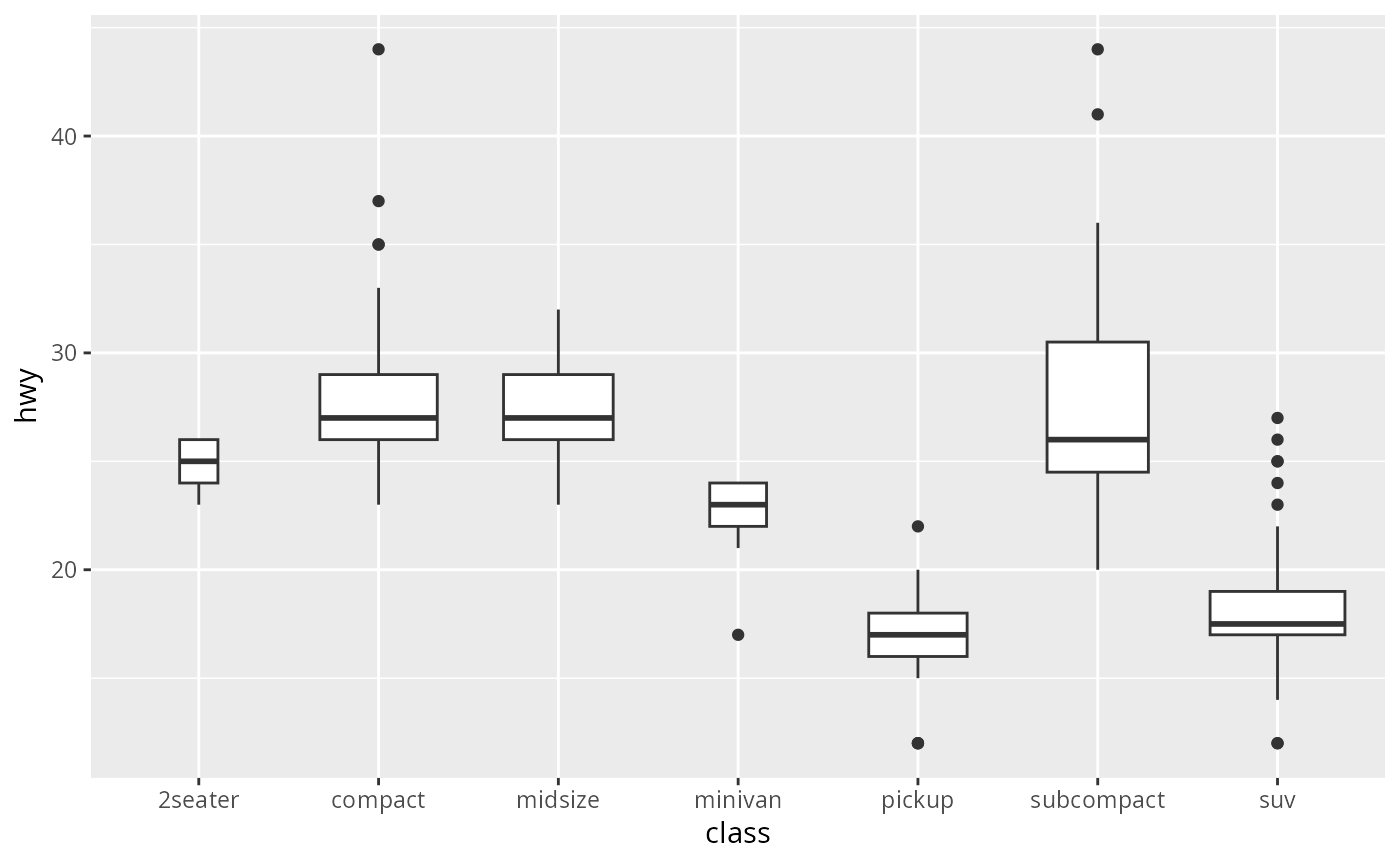 ggplot(mpg, aes(hwy, class)) + geom_boxplot()