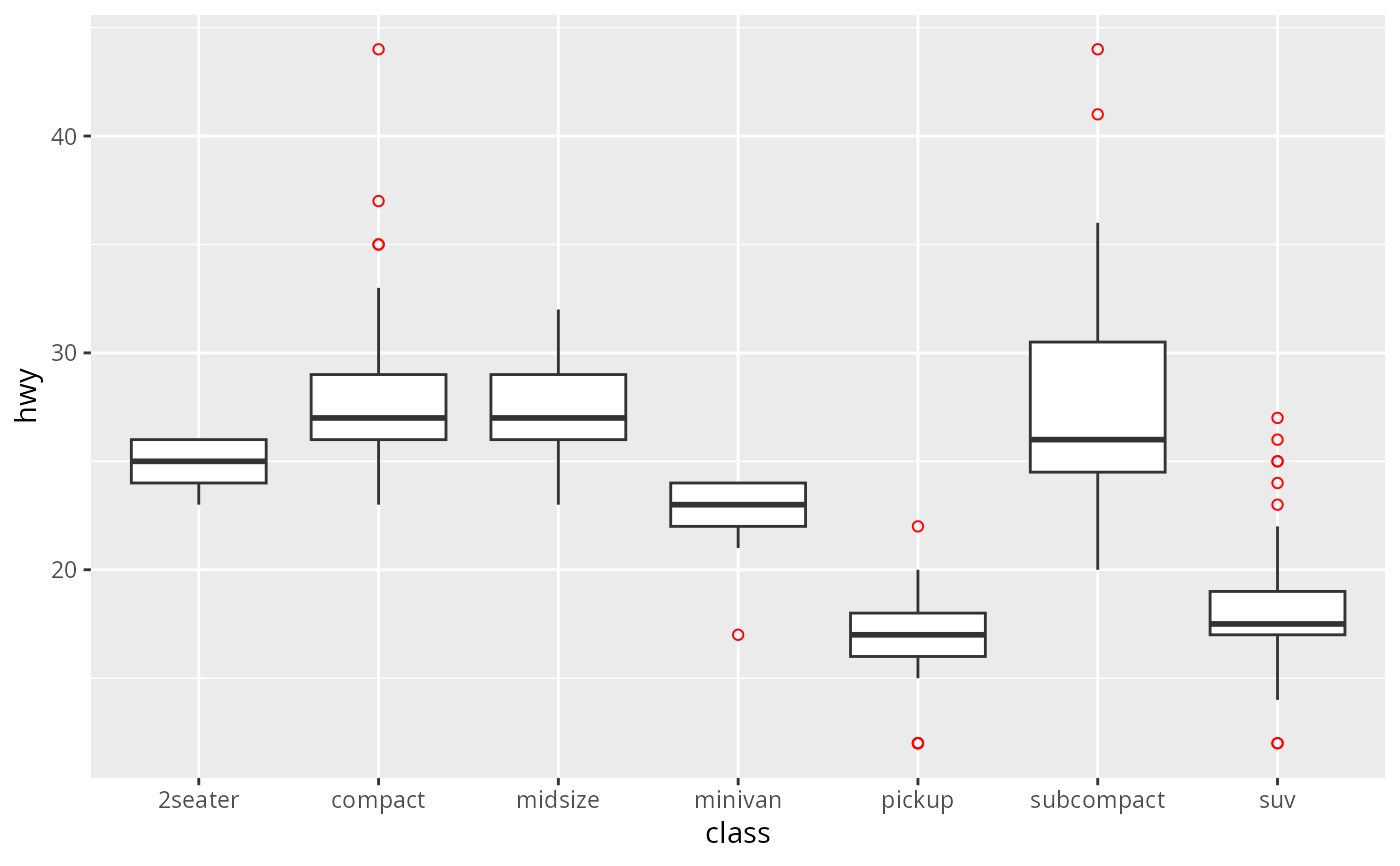p + geom_boxplot(outlier.colour = "red", outlier.shape = 1)
