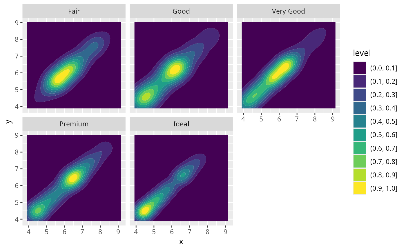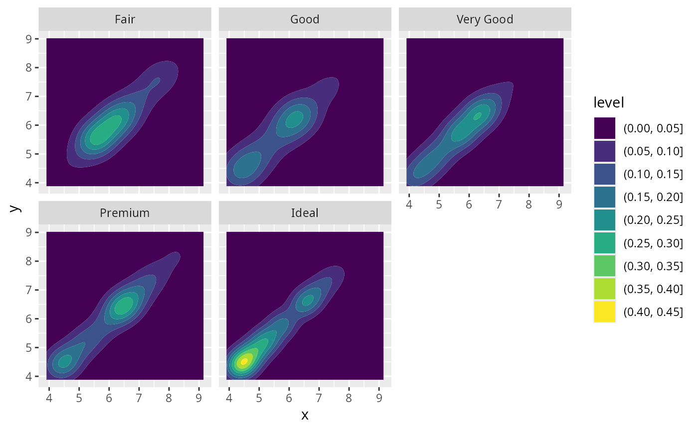 d + geom_density_2d_filled(contour_var = "ndensity") + facet_wrap(vars(cut))