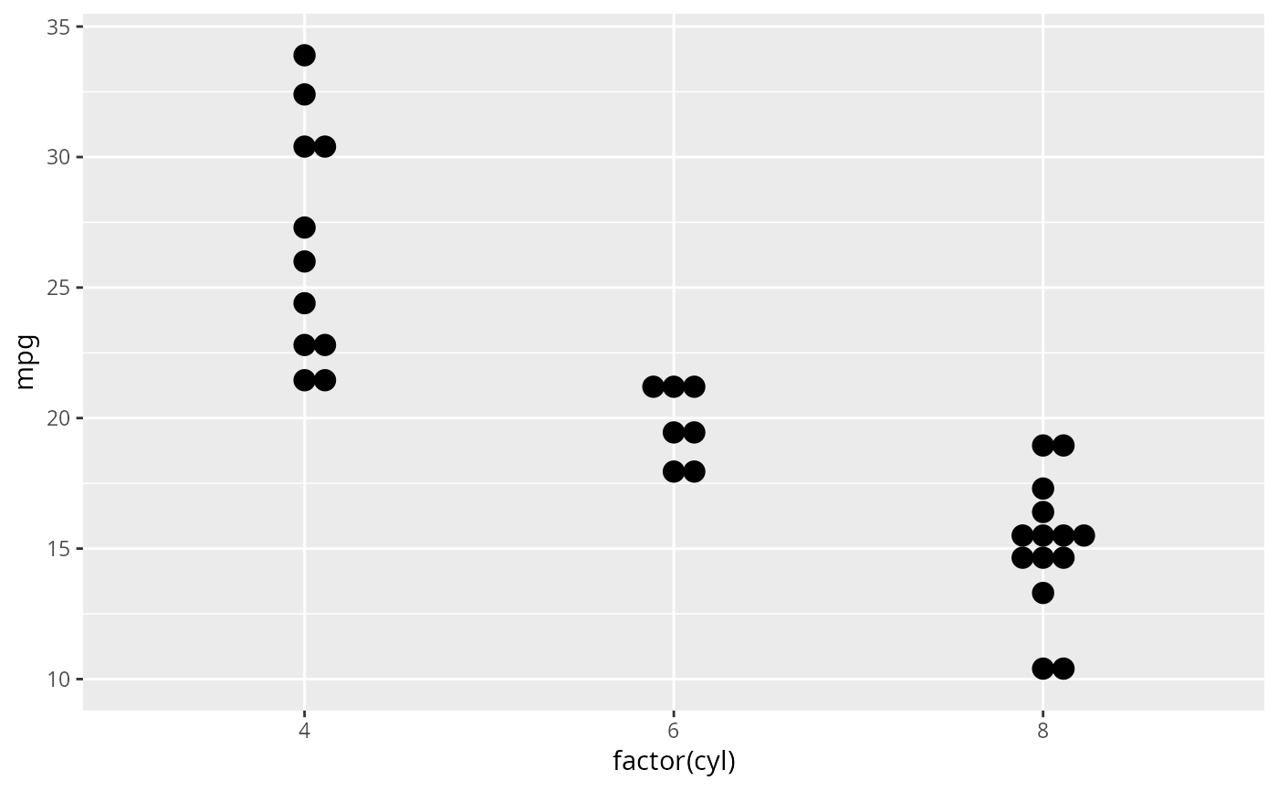 ggplot(mtcars, aes(x = factor(cyl), y = mpg)) +
