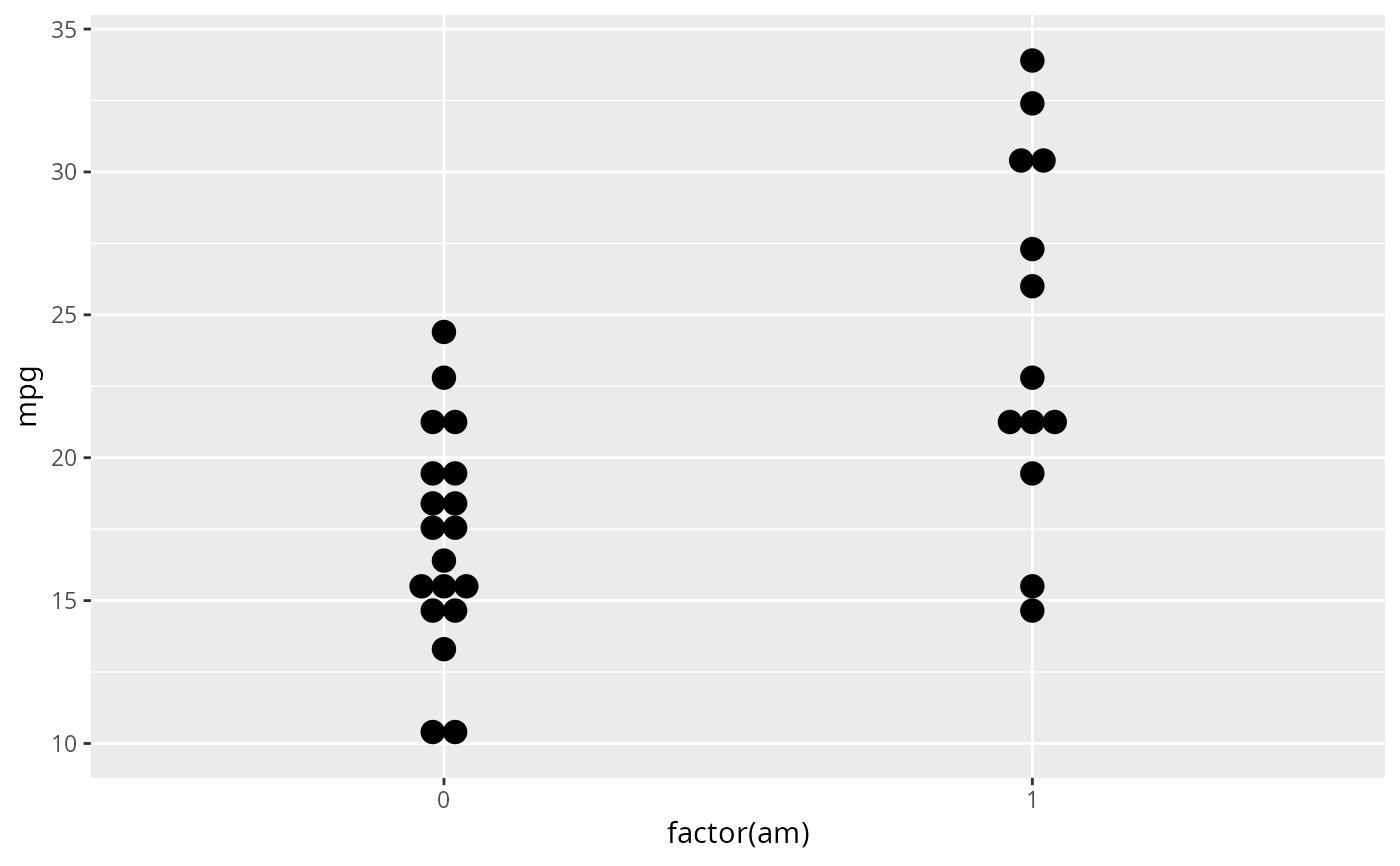 ggplot(mtcars, aes(x = factor(am), y = mpg)) +