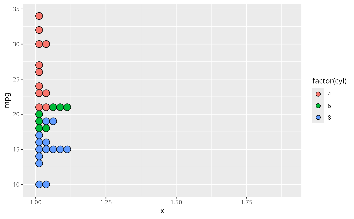 geom_dotplot(binaxis = "y", stackgroups = TRUE, binwidth = 1, method = "histodot")