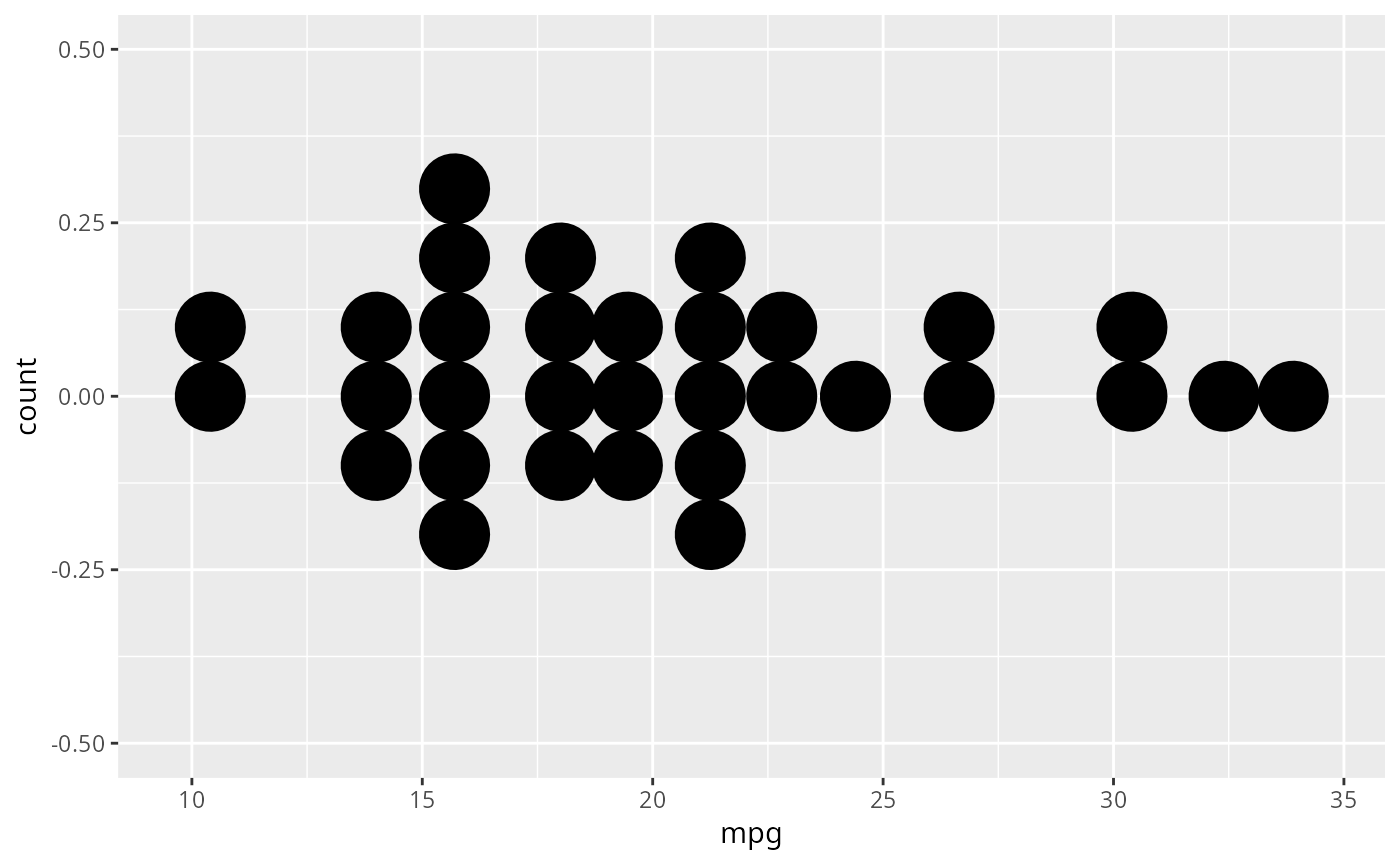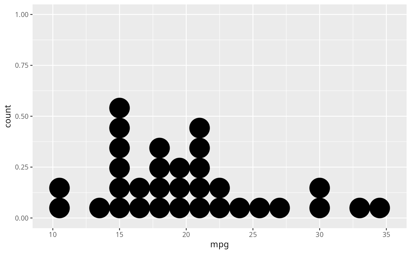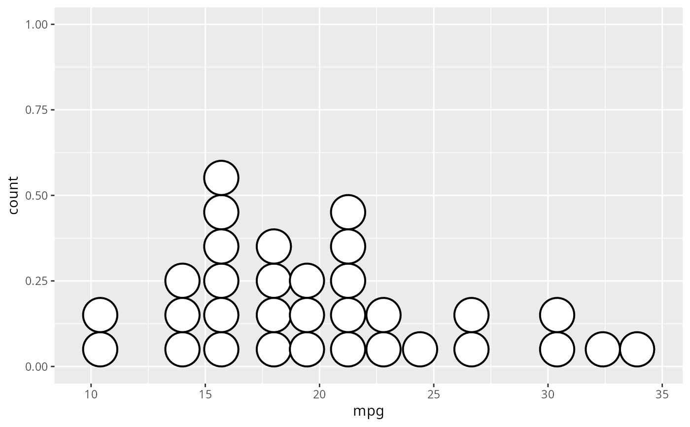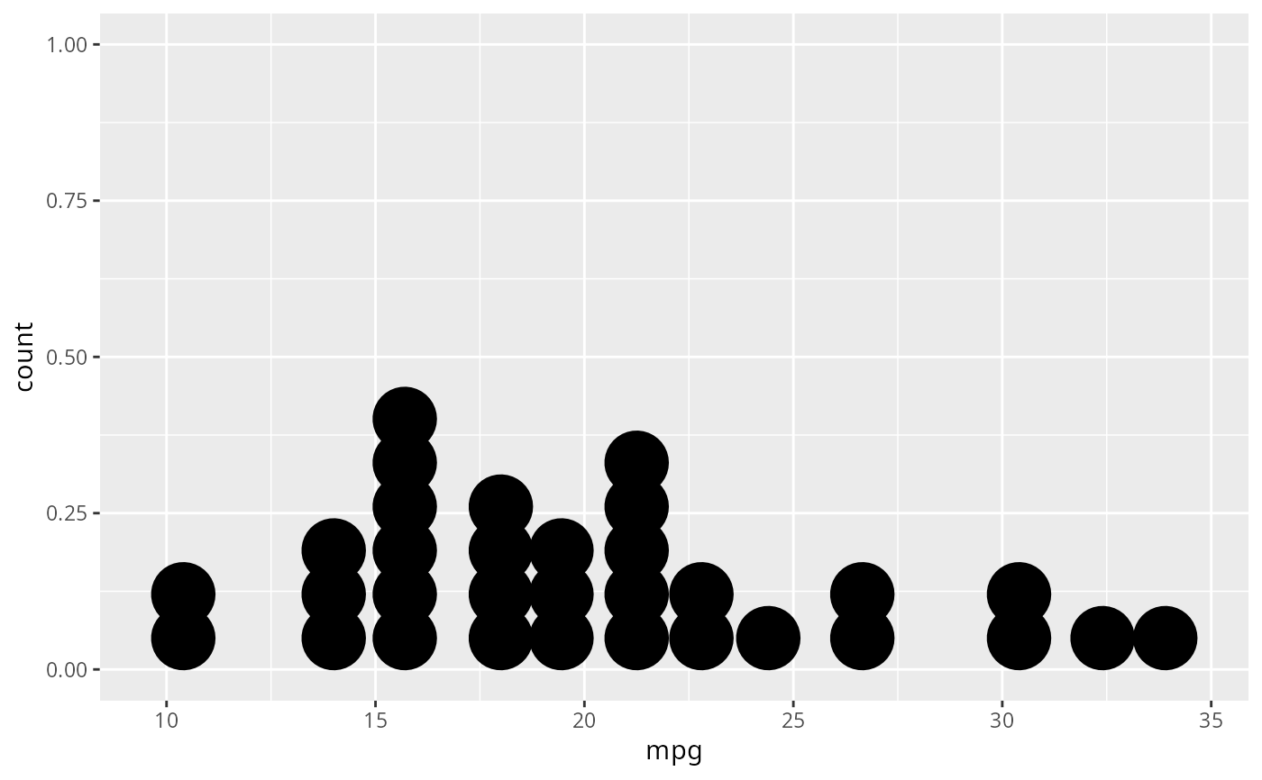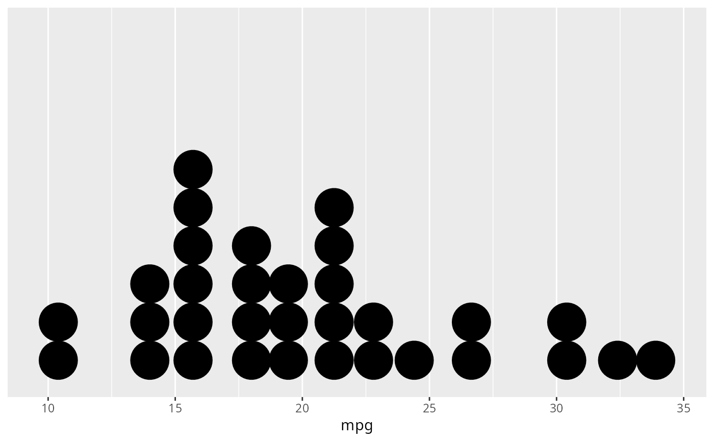 ggplot(mtcars, aes(x = mpg)) + geom_dotplot(binwidth = 1.5) +