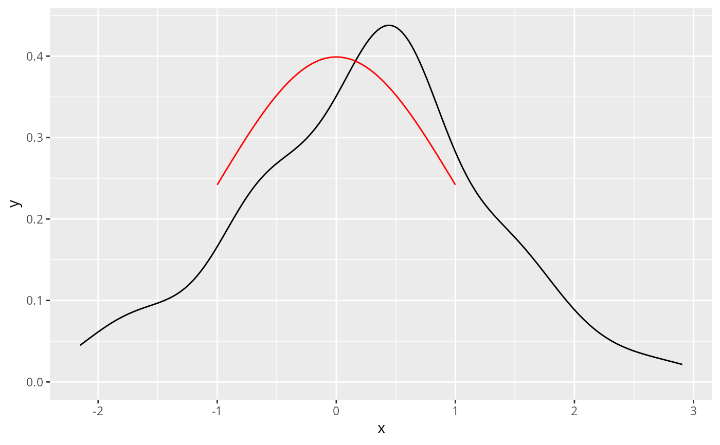 geom_function(fun = dnorm, colour = "red", xlim=c(-1, 1))