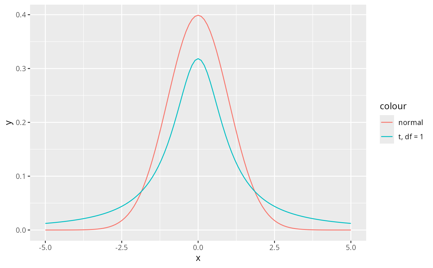 geom_function(aes(colour = "t, df = 1"), fun = dt, args = list(df = 1))