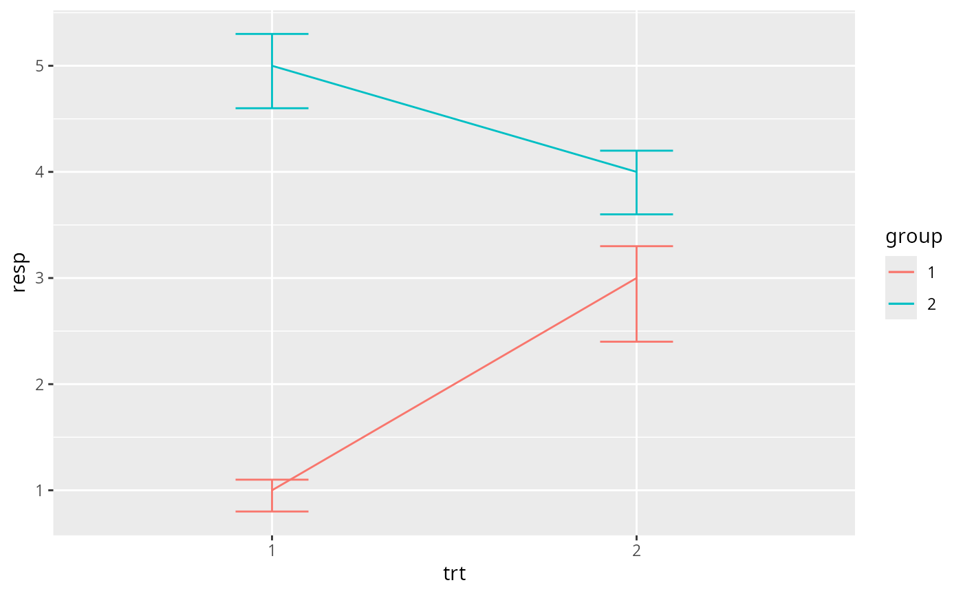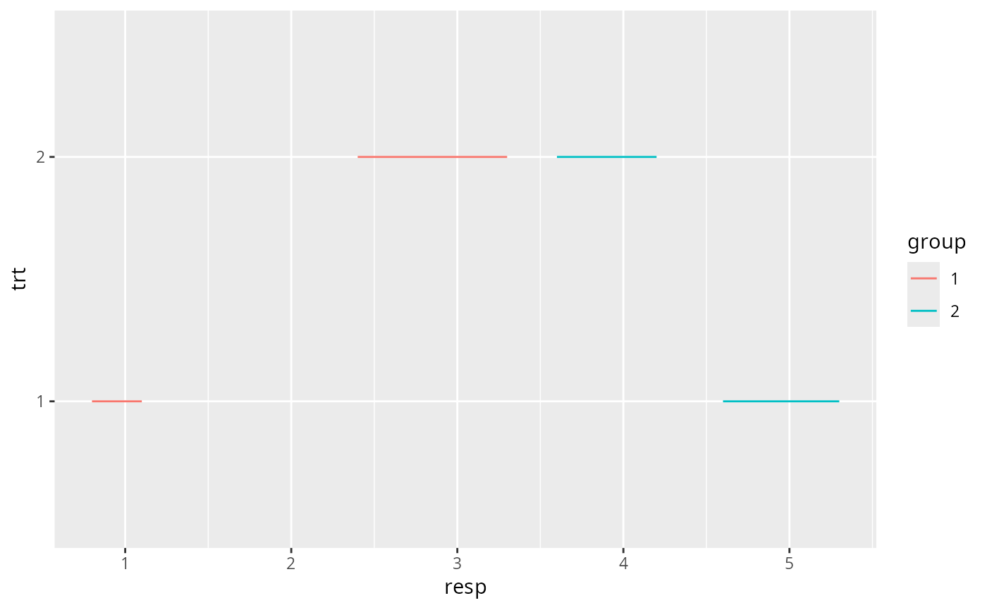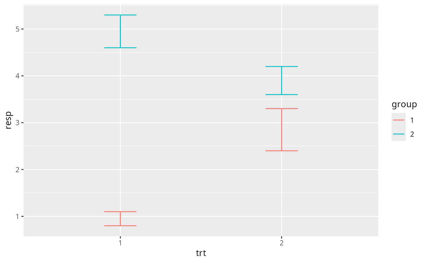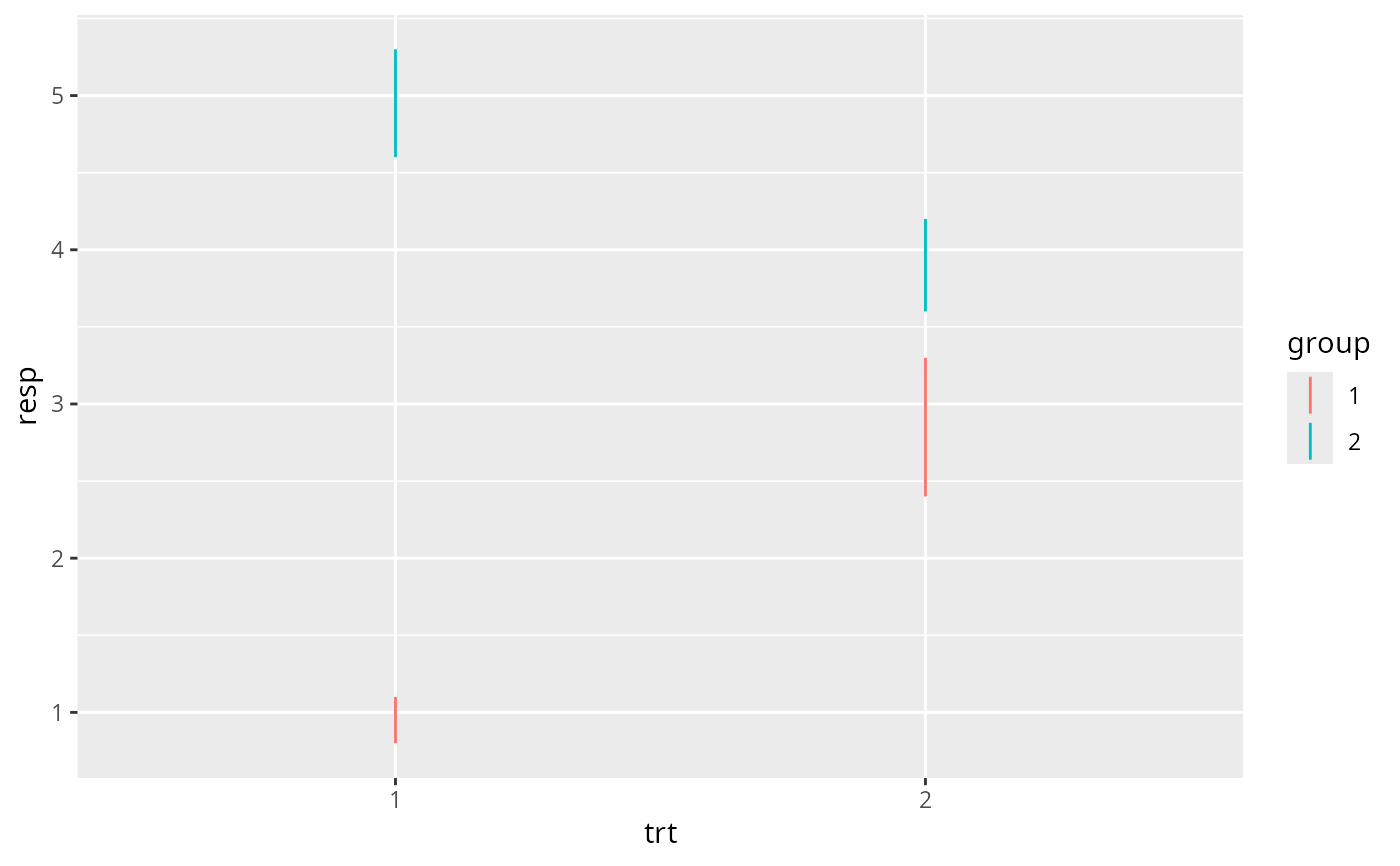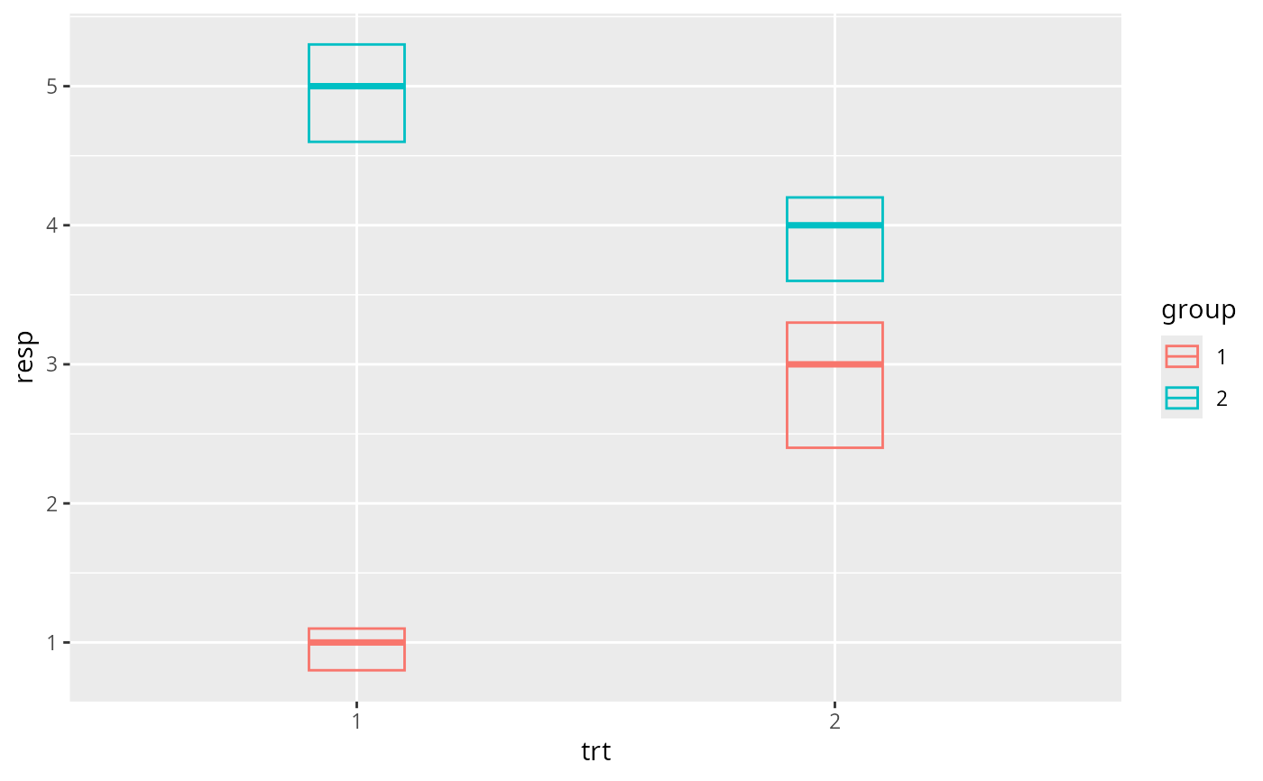 p <- ggplot(df, aes(trt, resp, colour = group))
