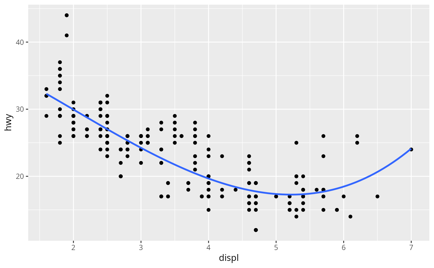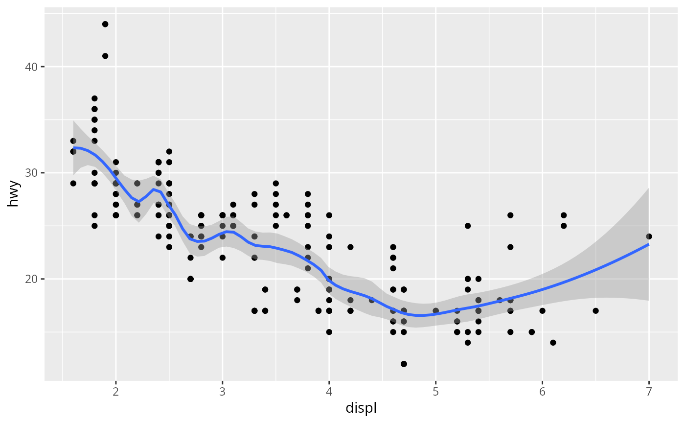 method = NULLthe smoothing method is chosen based on the size of the largest group (across all panels).stats::loess()is used for less than 1,000 observations; otherwisemgcv::gam()is used withformula = y ~ s(x, bs = "cs")withmethod = "REML". Somewhat anecdotally,loessgives a better appearance, but is \(O(N^{2})\) in memory, so does not work for larger datasets.If you have fewer than 1,000 observations but want to use the same