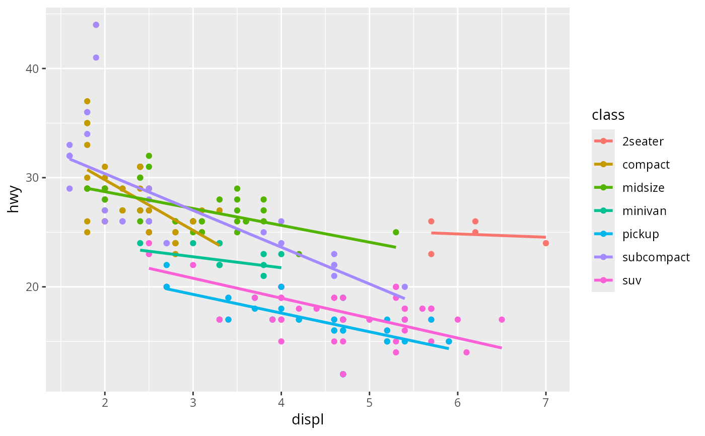 ggplot(mpg, aes(displ, hwy, colour = class)) +