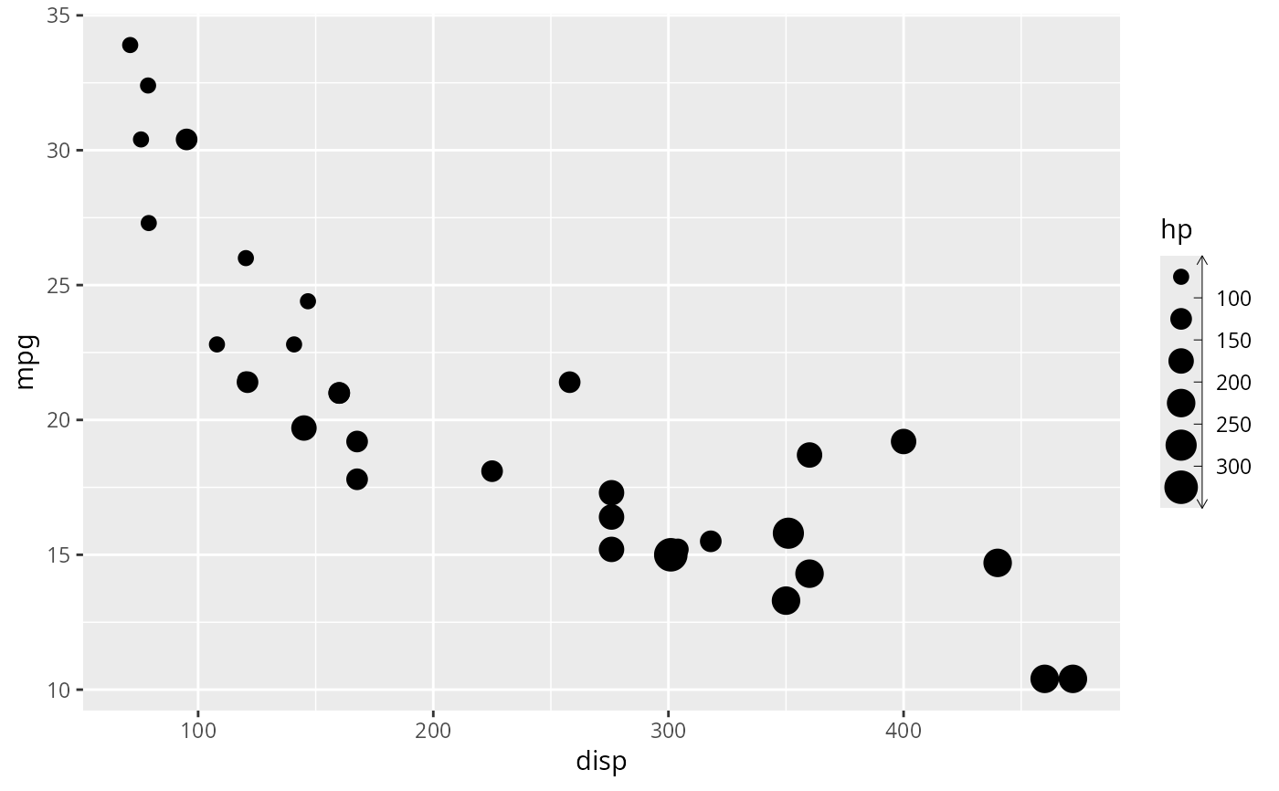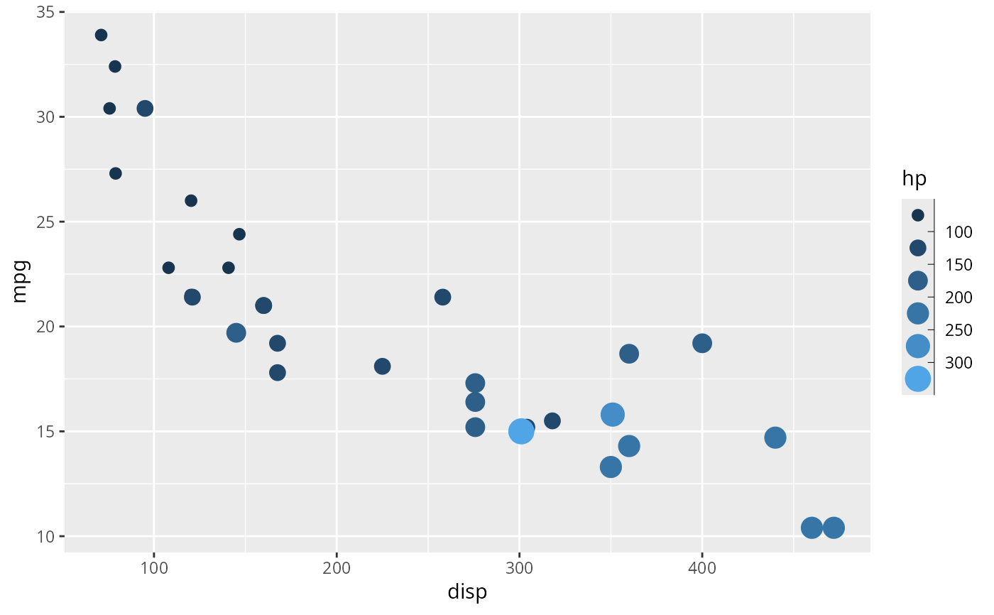 geom_point(aes(disp, mpg, size = hp, colour = hp)) +