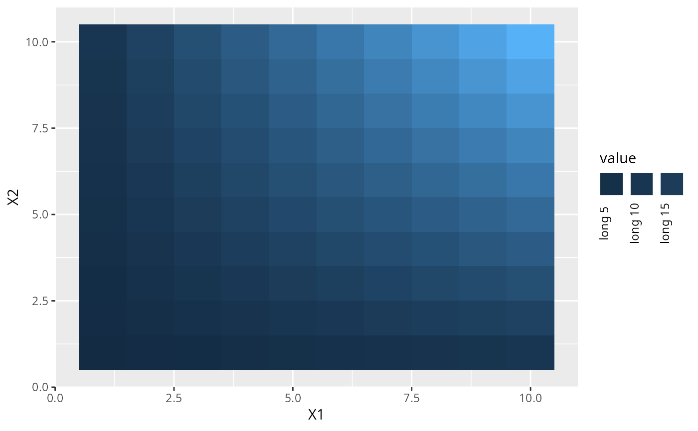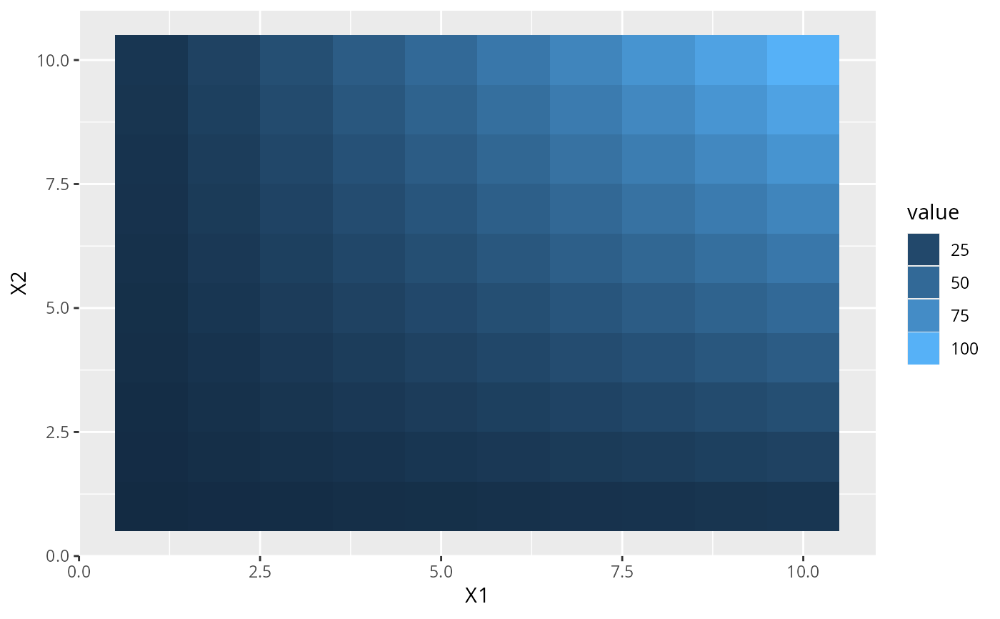 p1 <- ggplot(df, aes(X1, X2)) + geom_tile(aes(fill = value))