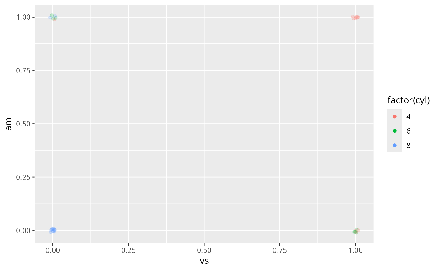 p3 <- ggplot(mtcars, aes(vs, am, colour = factor(cyl))) +