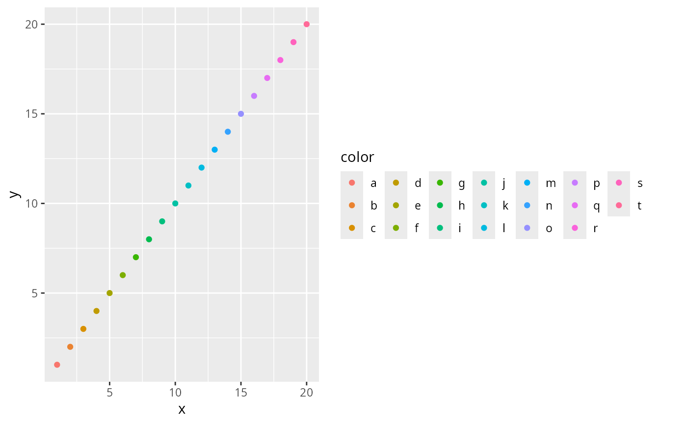 df <- data.frame(x = 1:20, y = 1:20, color = letters[1:20])