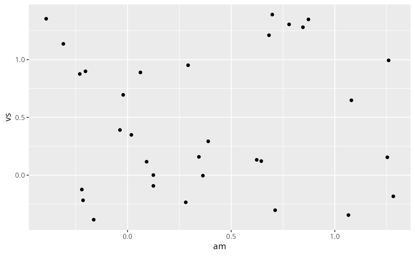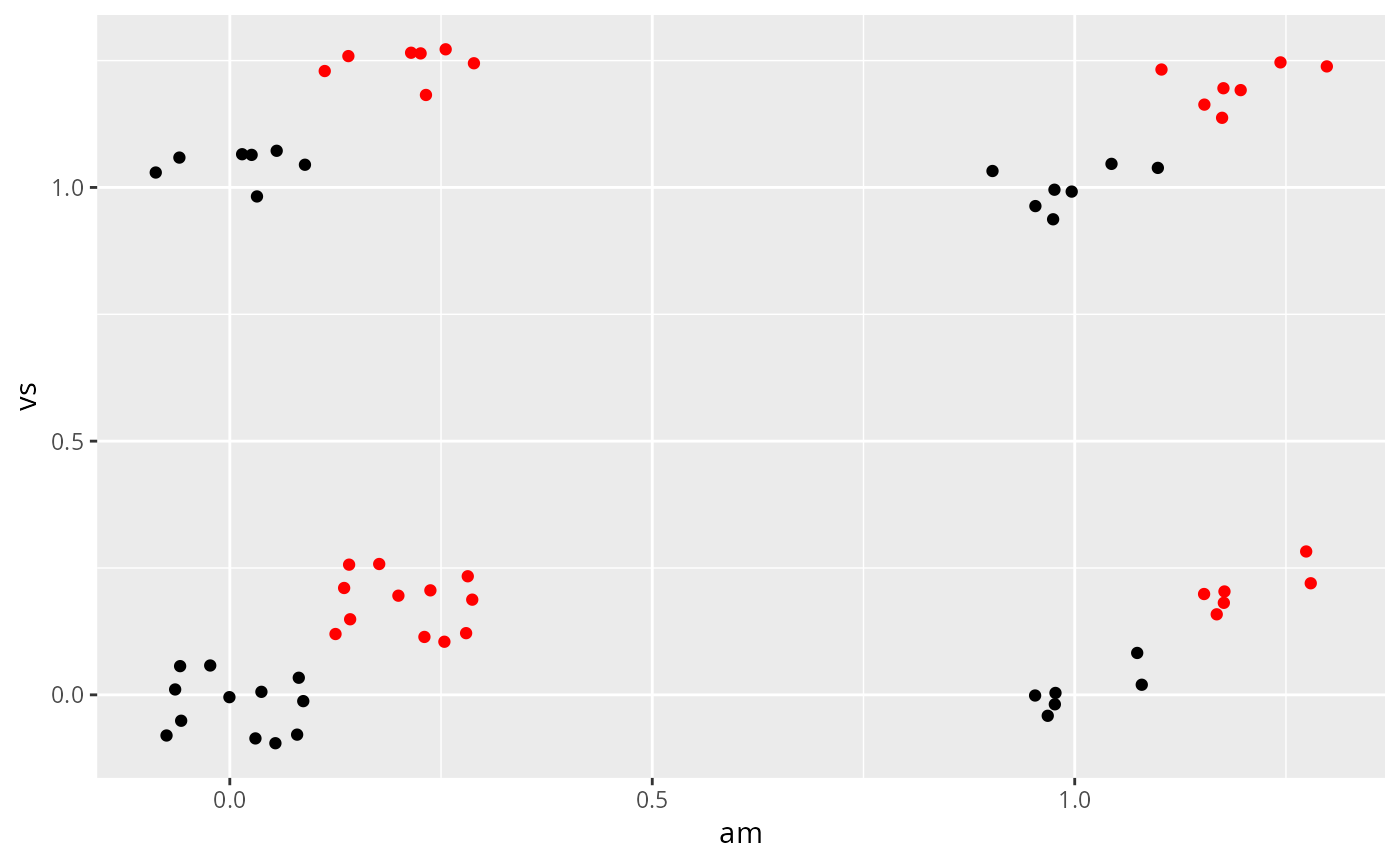 geom_point(position = jitter, color = "red", aes(am + 0.2, vs + 0.2))