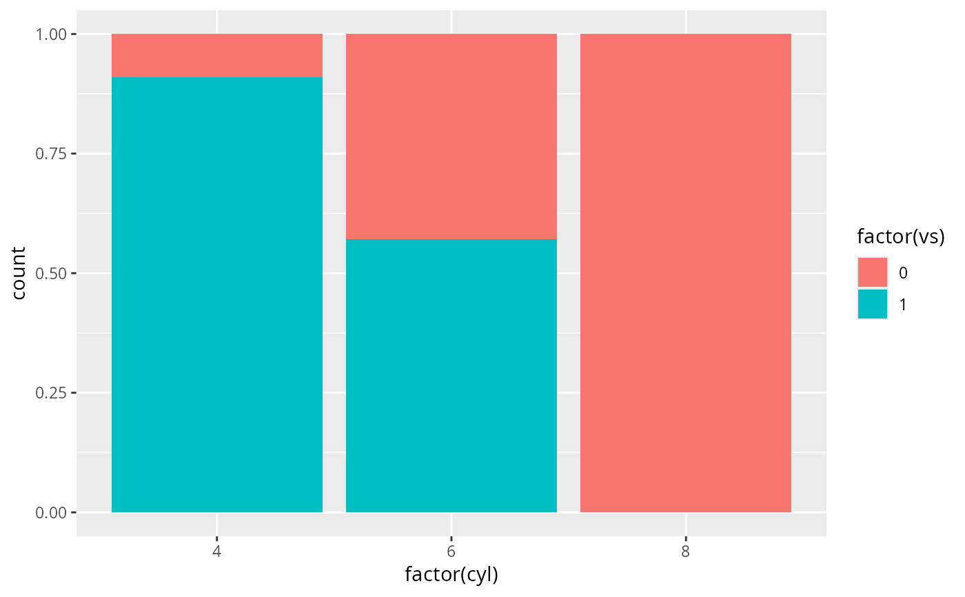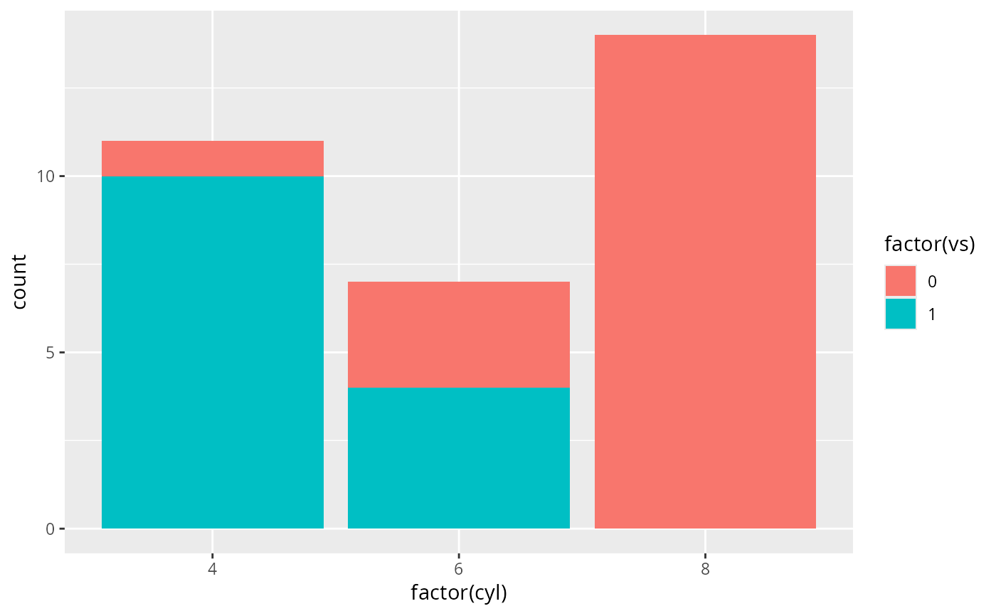 ggplot(mtcars, aes(factor(cyl), fill = factor(vs))) +
