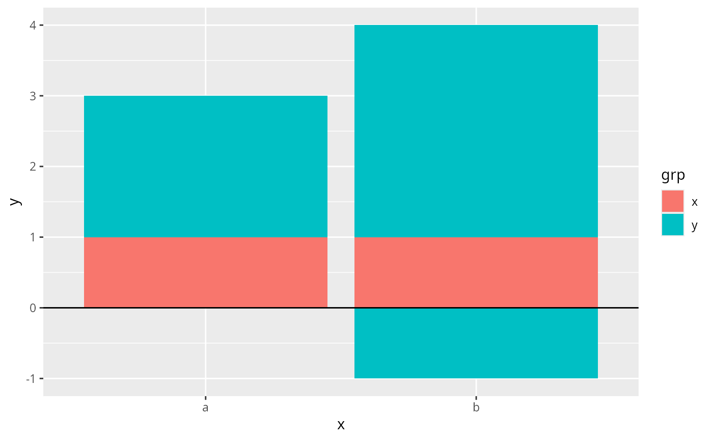 Because stacking is performed after scale transformations, stacking with non-linear scales gives distortions that easily lead to misinterpretations of the data. It is therefore discouraged to use these position adjustments in combination with scale transformations, such as logarithmic or square root scales.