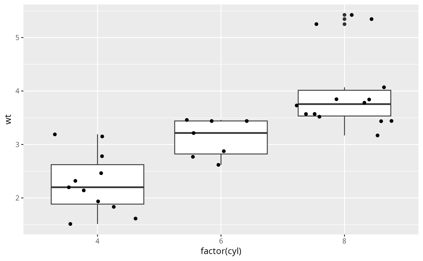 qplot(factor(cyl), wt, data = mtcars, geom = c("boxplot", "jitter"))