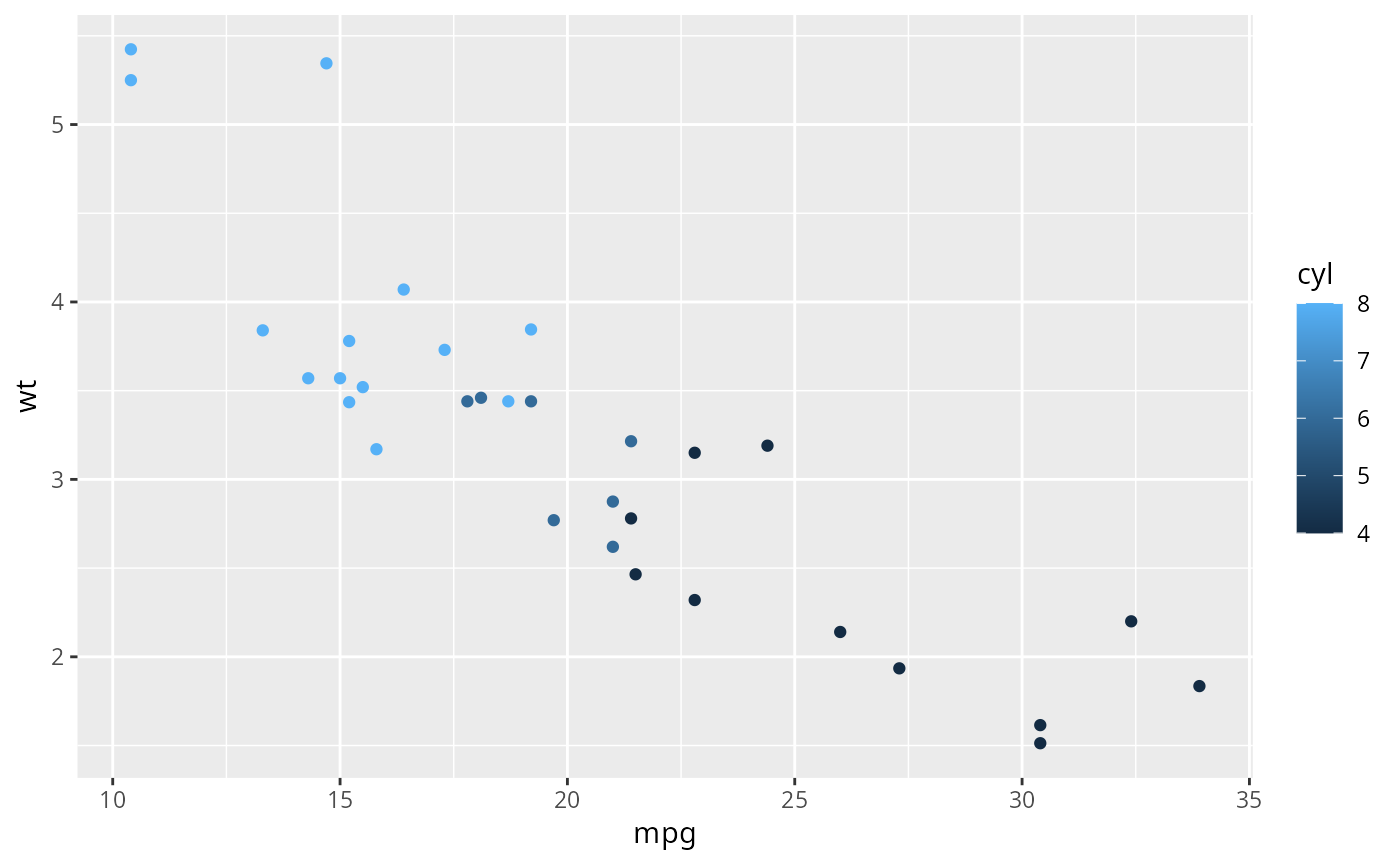 qplot(mpg, wt, data = mtcars, colour = cyl)