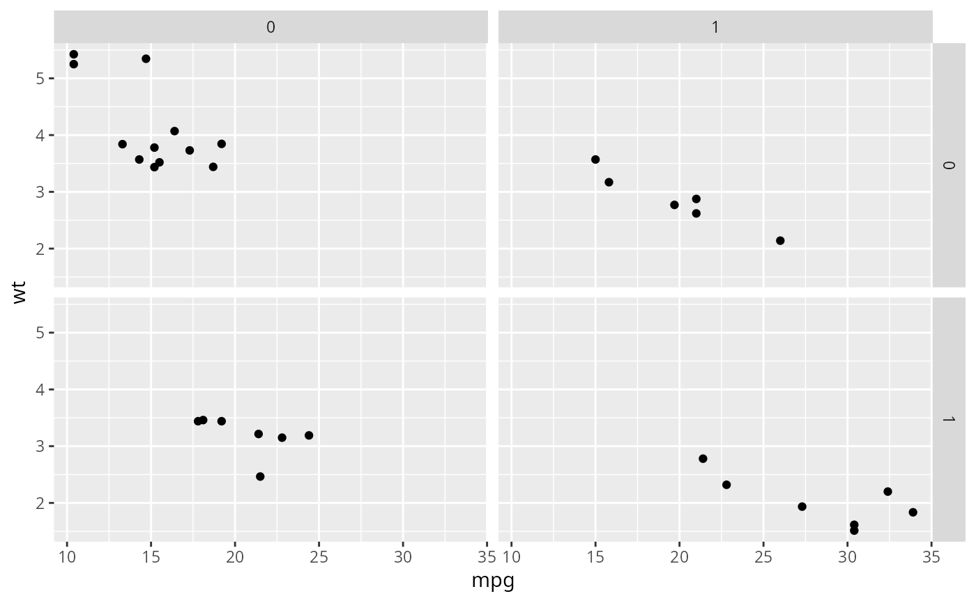 qplot(mpg, wt, data = mtcars, facets = vs ~ am)