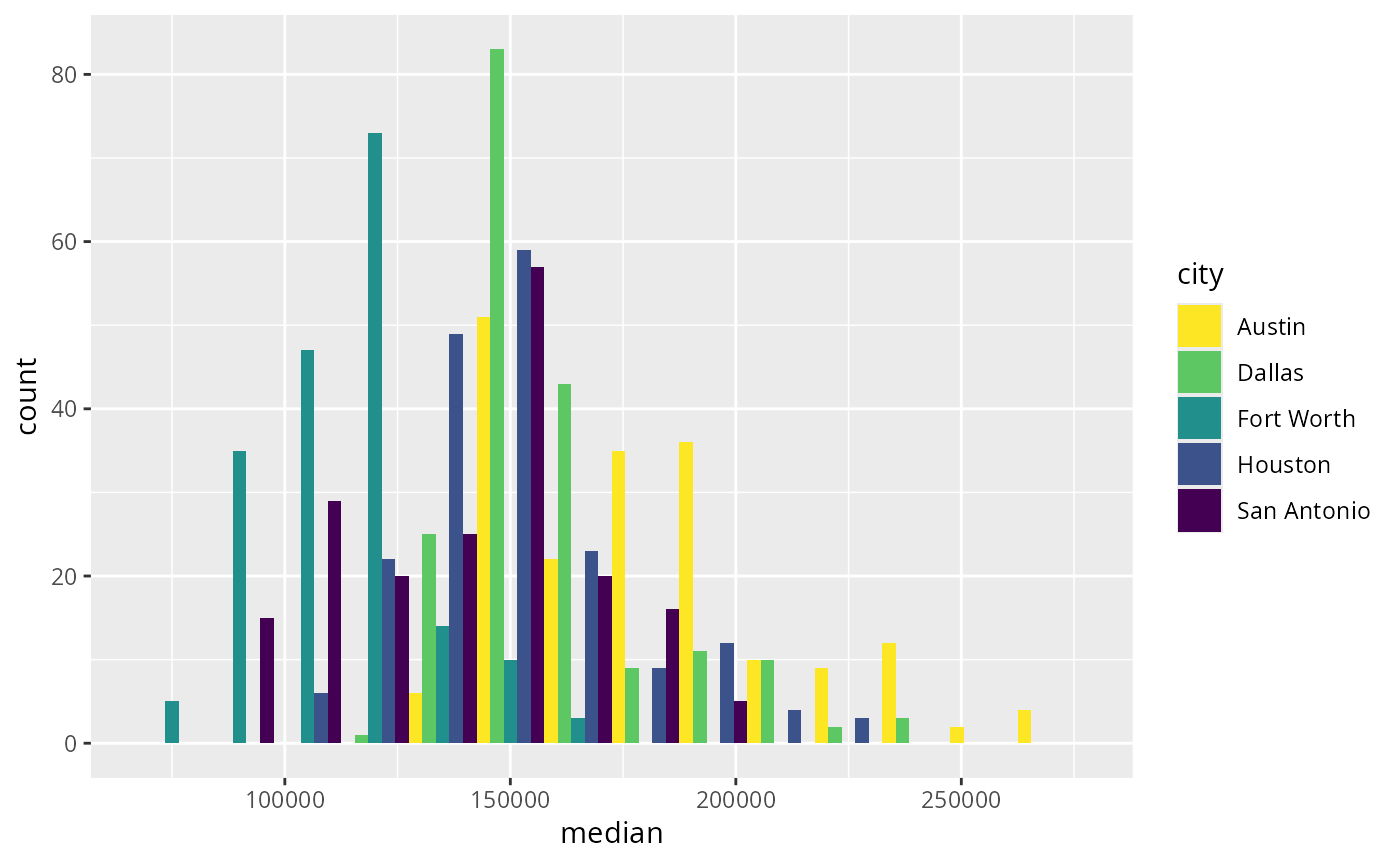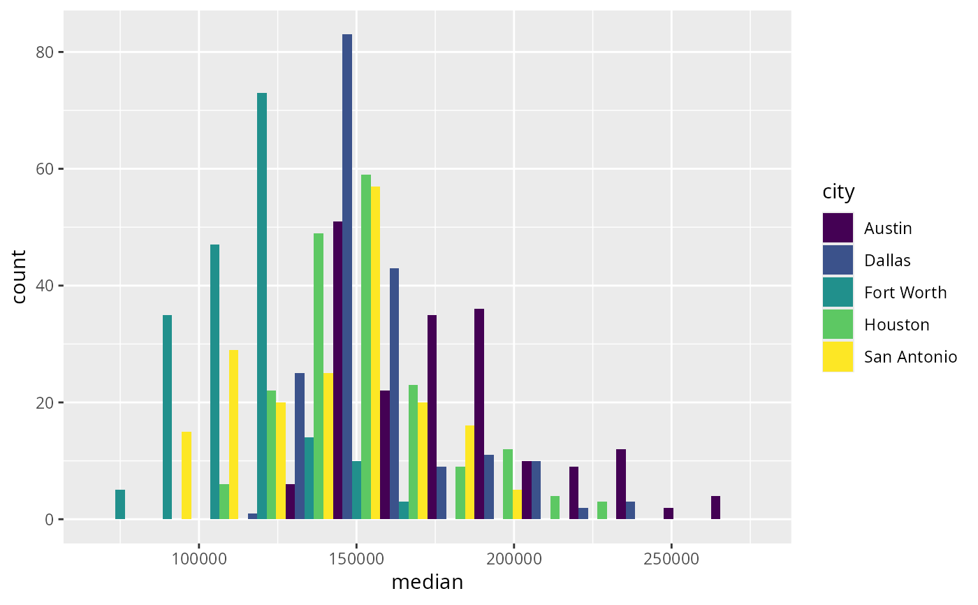 p <- ggplot(txsamp, aes(x = median, fill = city)) +