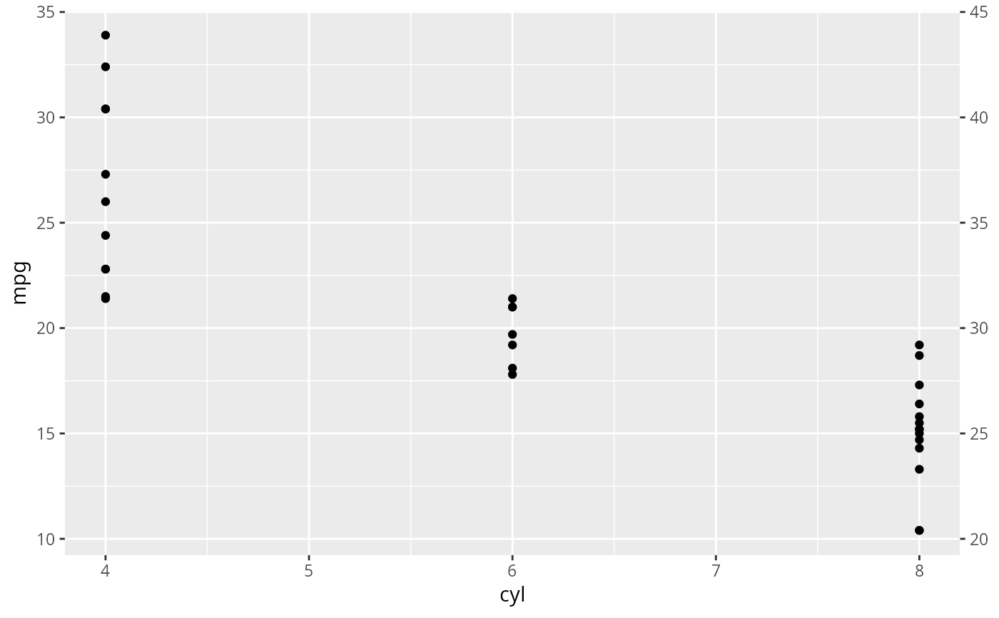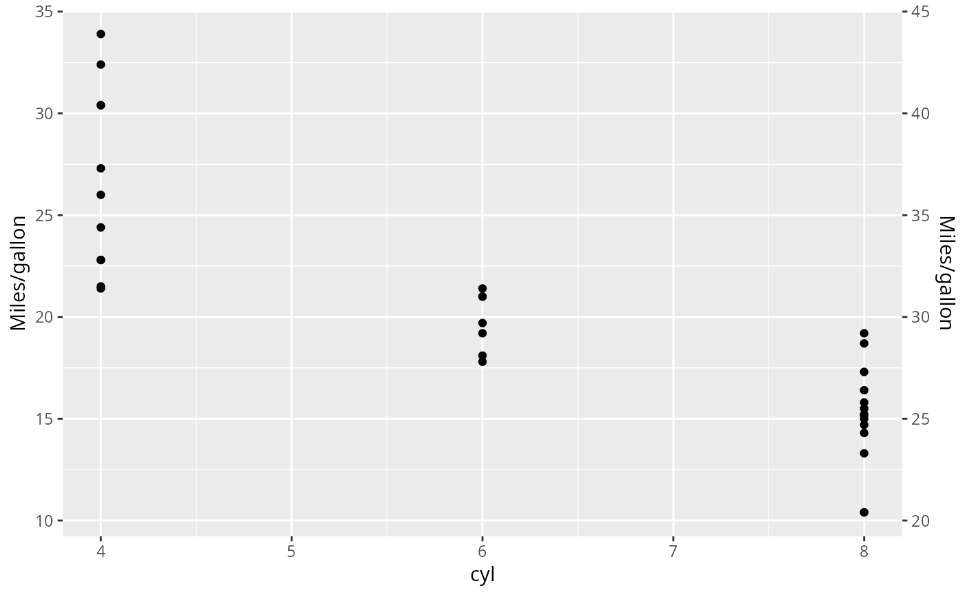 p + scale_y_continuous("Miles/gallon", sec.axis = sec_axis(~ . + 10, name = derive()))