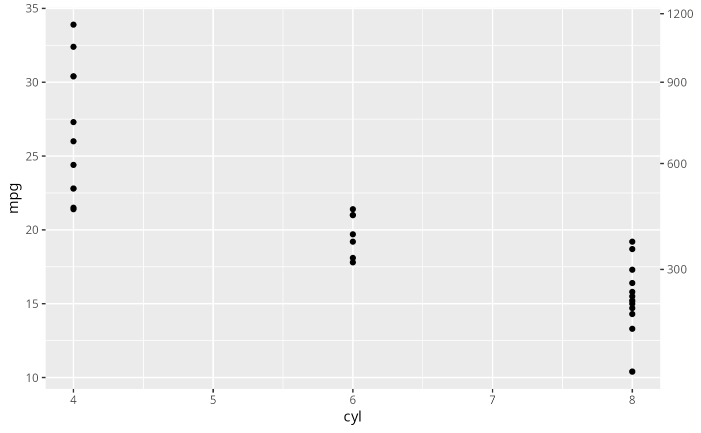 This function is used in conjunction with a position scale to create a secondary axis, positioned opposite of the primary axis. All secondary axes must be based on a one-to-one transformation of the primary axes.