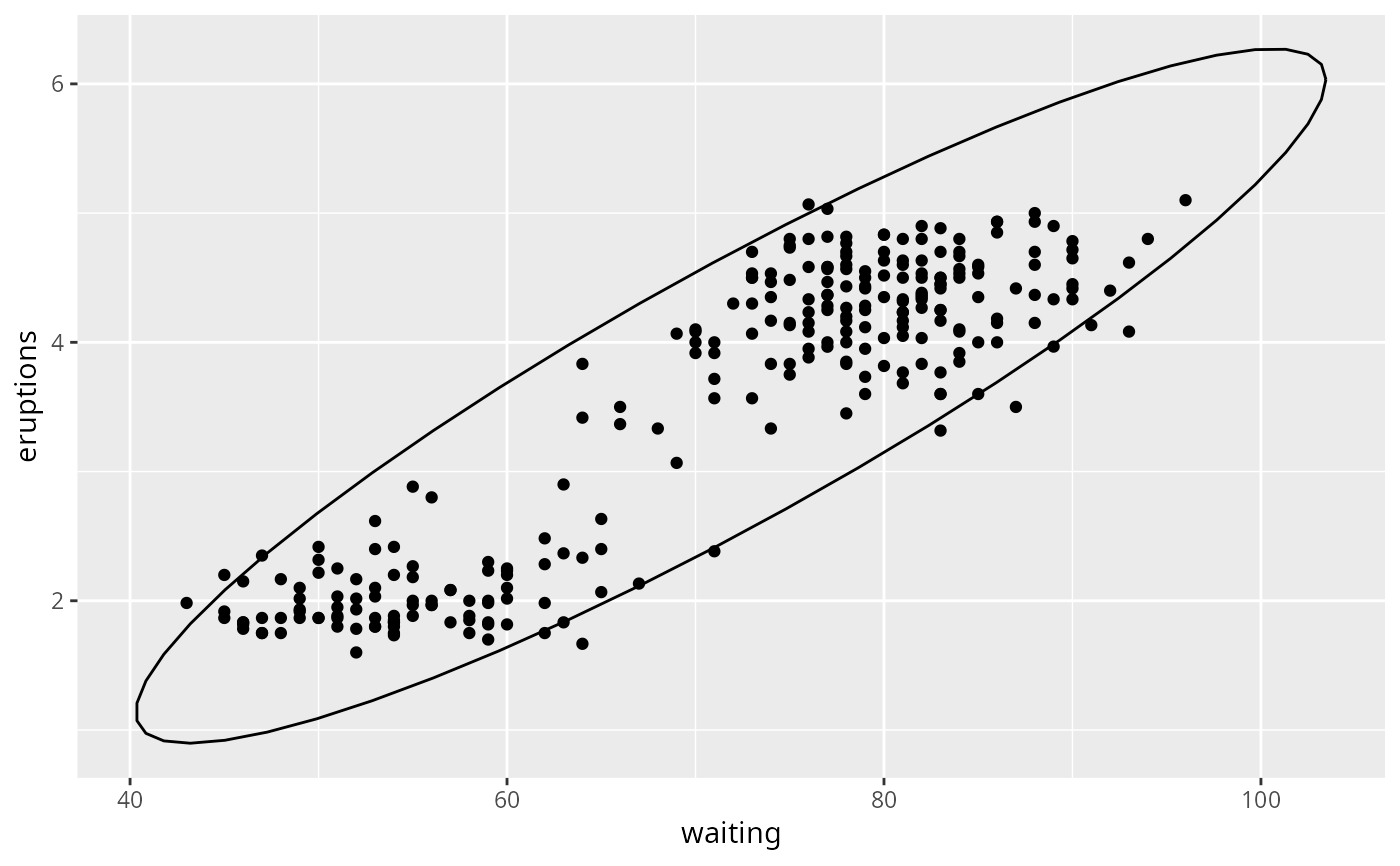 "t"assumes a multivariate t-distribution, and"norm"assumes a multivariate normal distribution."euclid"draws a circle with the radius equal tolevel, representing the euclidean distance from the center. This ellipse probably won't appear circular unlesscoord_fixed()is applied.- level