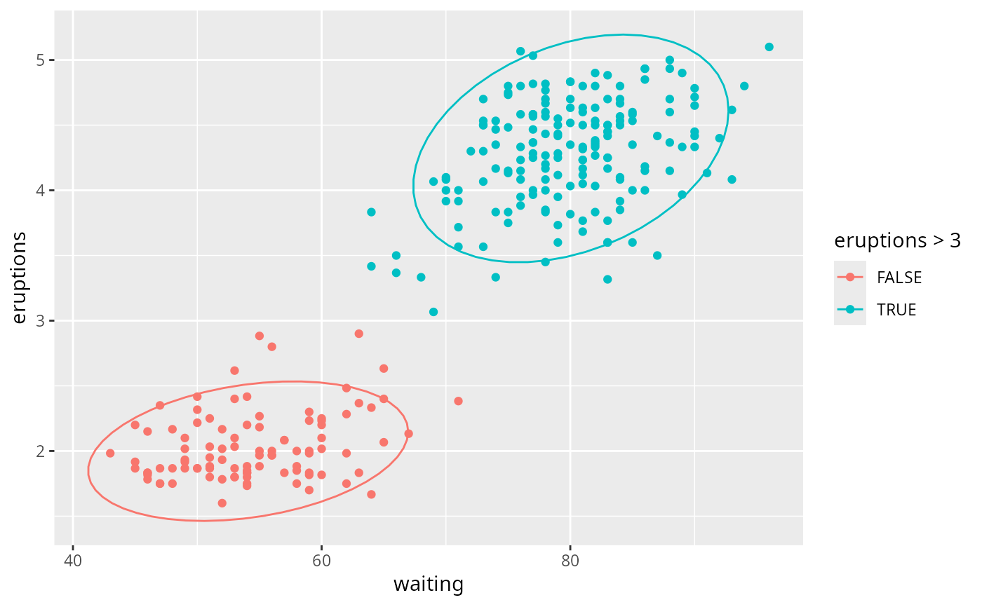 ggplot(faithful, aes(waiting, eruptions, fill = eruptions > 3)) +