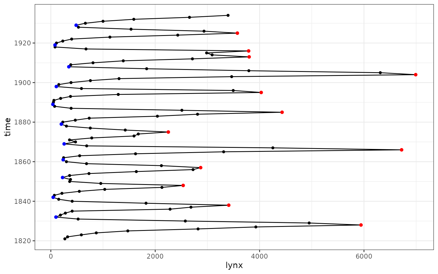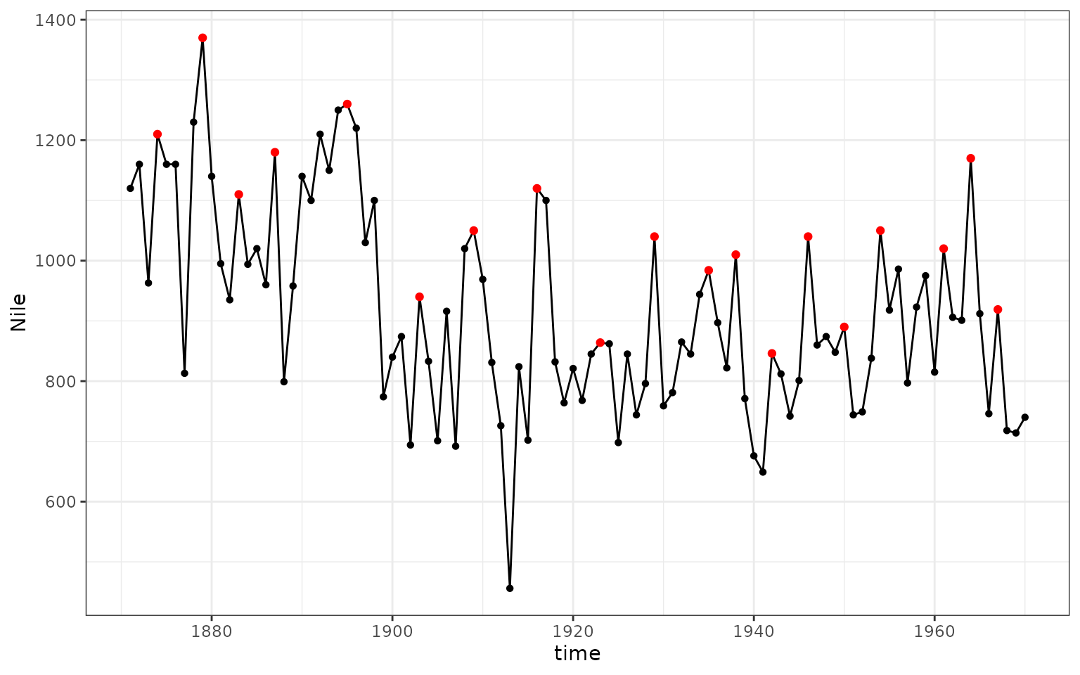 Below the time series lynx and Nile are used taking advantage of specializations of method ggplot() defined in package ‘ggpp’, which automatically convert time series stored in objects of classes ts or xts into data frames. They by default also map time to the x aesthetic and the observed variable to the y aesthetic. An argument created by a call to aes() and passed as argument to formal parameter mapping overrides the default. Functions stat_peaks() and stat_valleys() from package ‘ggpmisc’ can be used with numeric, date or datetime values mapped to x. An argument passed to parameter orientation can be used to flip the data before the search of peaks and valleys.