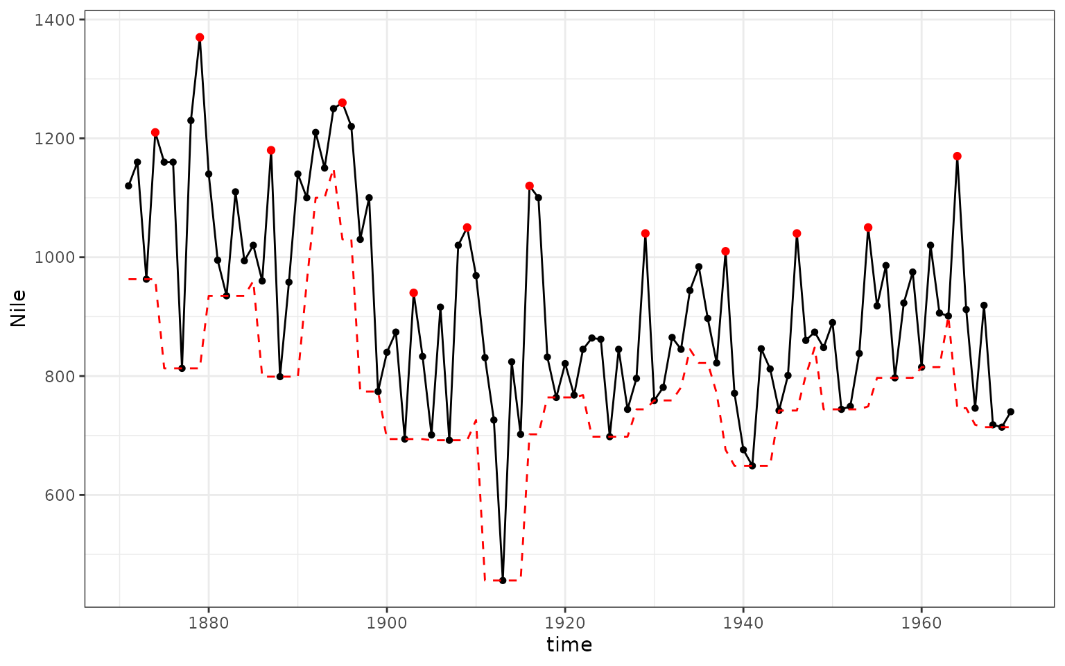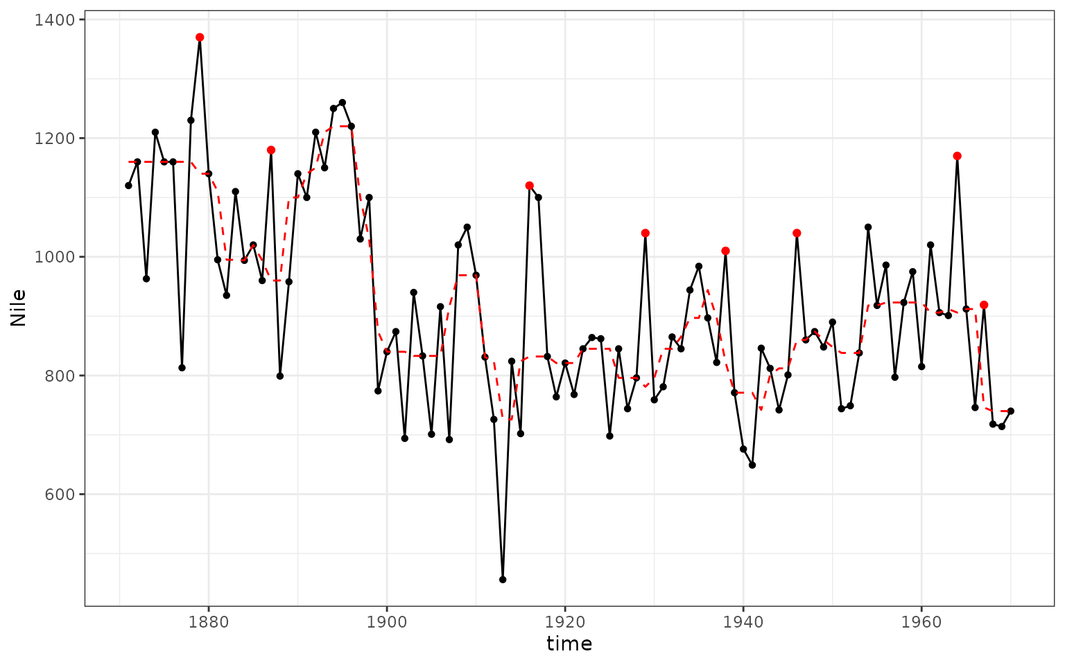 geom_line(aes(y = stats::runmed(Nile, k = 5, endrule = "median")), colour = "red", linetype = "dashed")