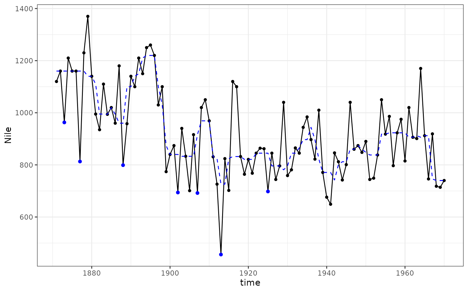 geom_line(aes(y = stats::runmed(Nile, k = 5, endrule = "median")), colour = "blue", linetype = "dashed")