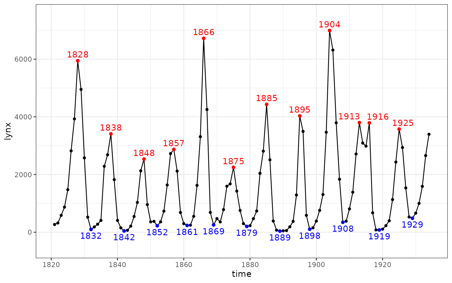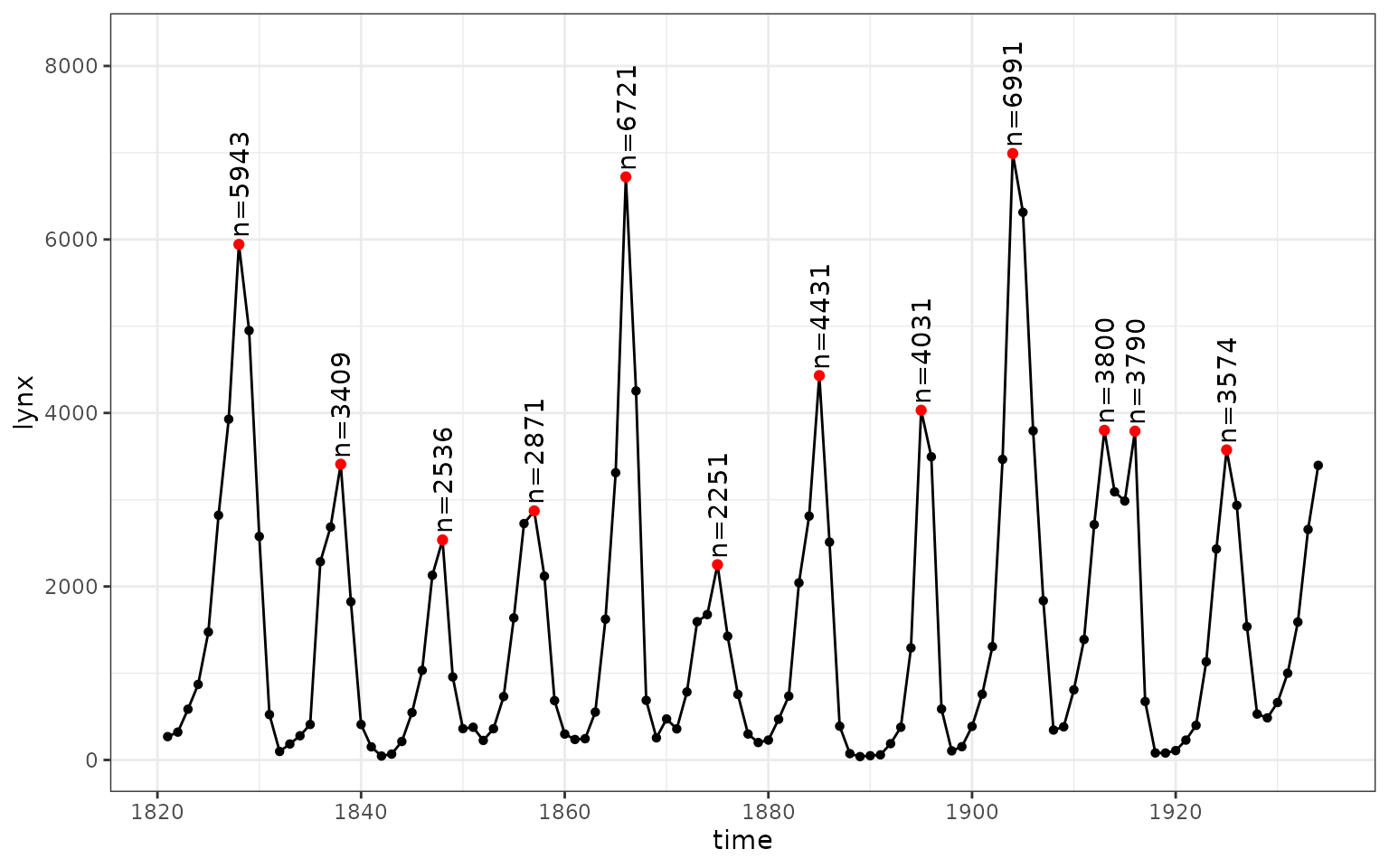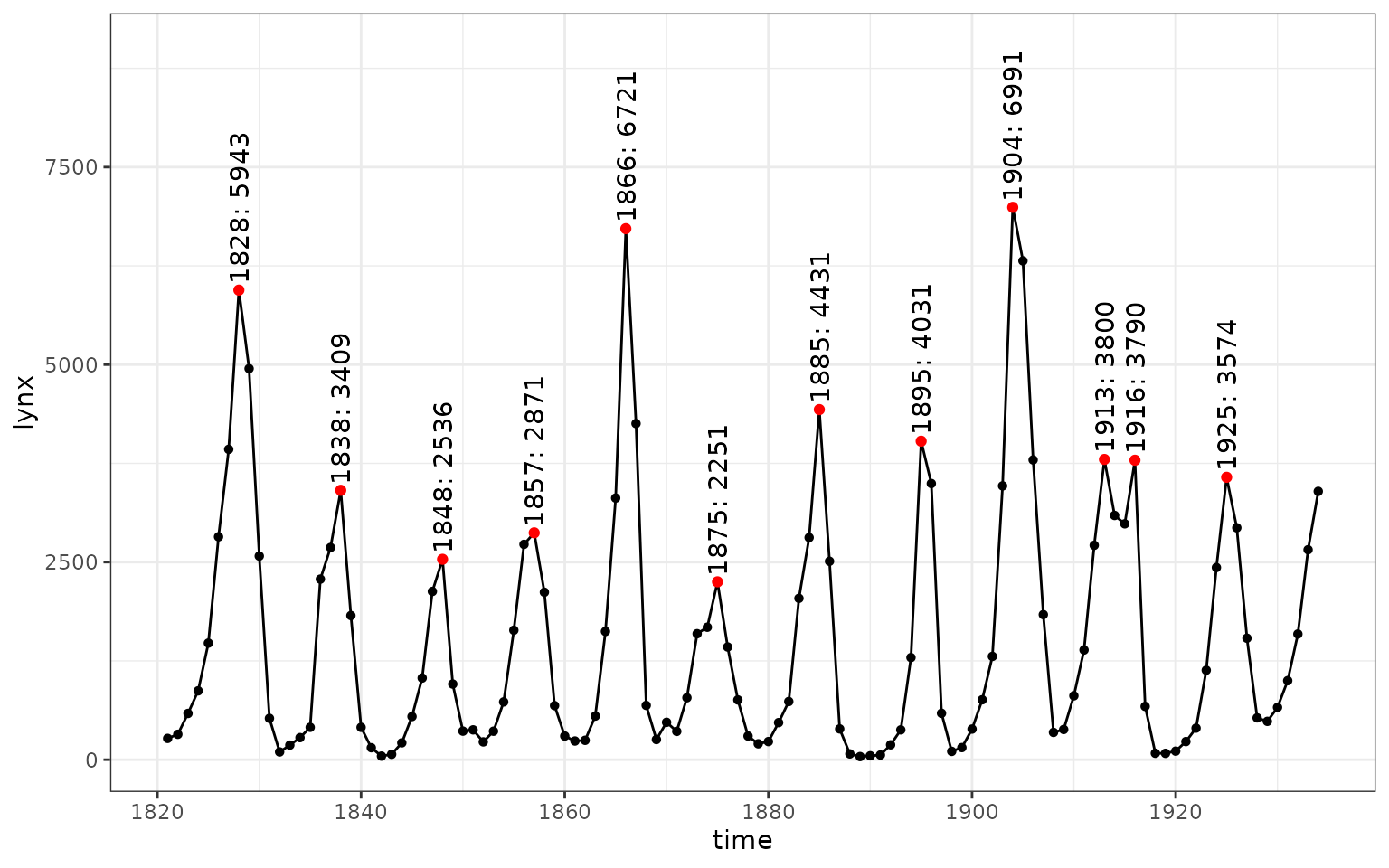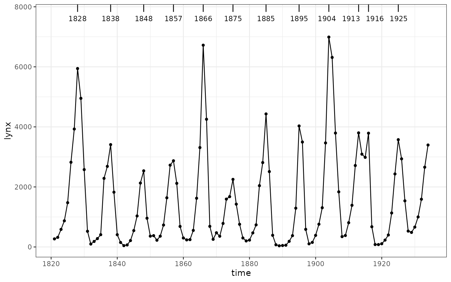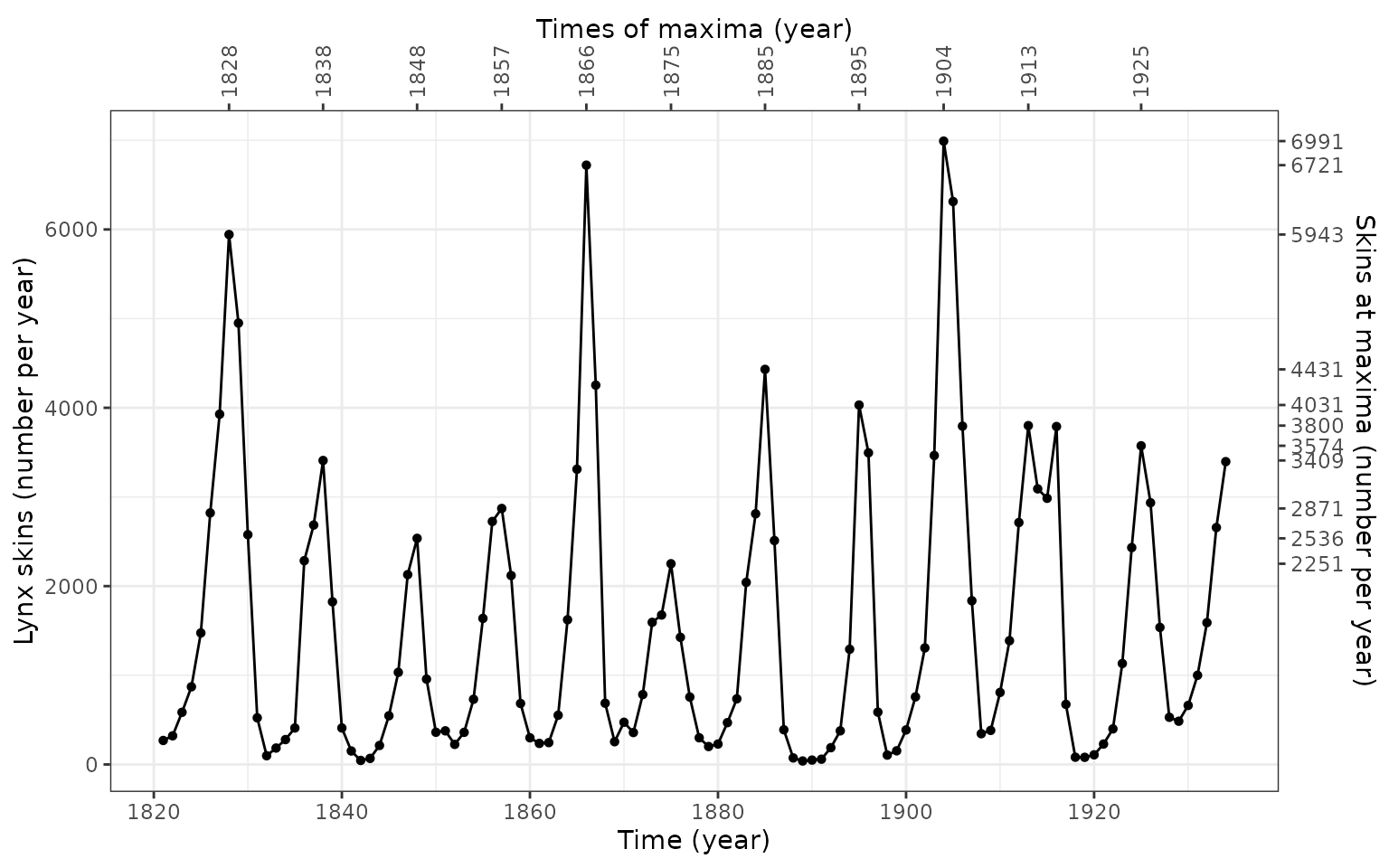 Function find_peaks(), is used internally in ‘ggpmisc’ to implement stat_peaks() and stat_valleys(). It can also be used on its own. Because of of the value expected by scales’ breaks parameter, it is not possible to call this function on the fly within a call to sec_axis() with the plot data as an implicit argument. However, find_peaks() can be used to generate vectors that can be passed as an argument to parameter breaks. Below, to set breaks in the secondary axes, we first create vectors of dates and numbers of lynx skins at the peaks, and then use them as arguments in the call to sec_axis(). Currently, there is no support for repulsion of axis tick labels in packages ‘ggplot2’ or ‘legendry’, so to avoid overlaps fewer peaks have to be annotated than in the plots above. The use of span = 11, which is wider than the default span = 5, to search for peaks results in the peak in year 1916, adjacent to that in year 1913, to be ignored.