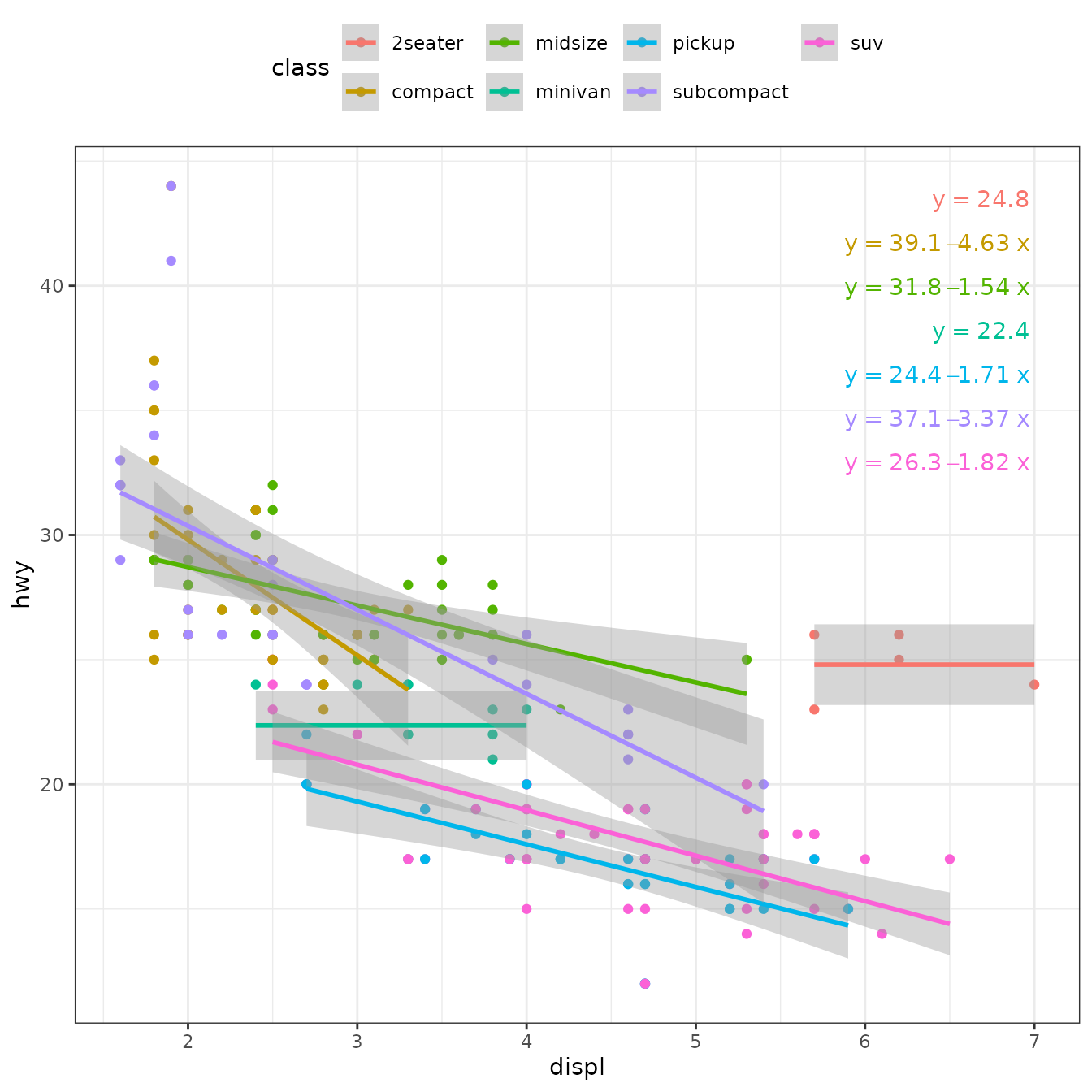 ggplot(mpg, aes(displ, hwy, color = class)) +
