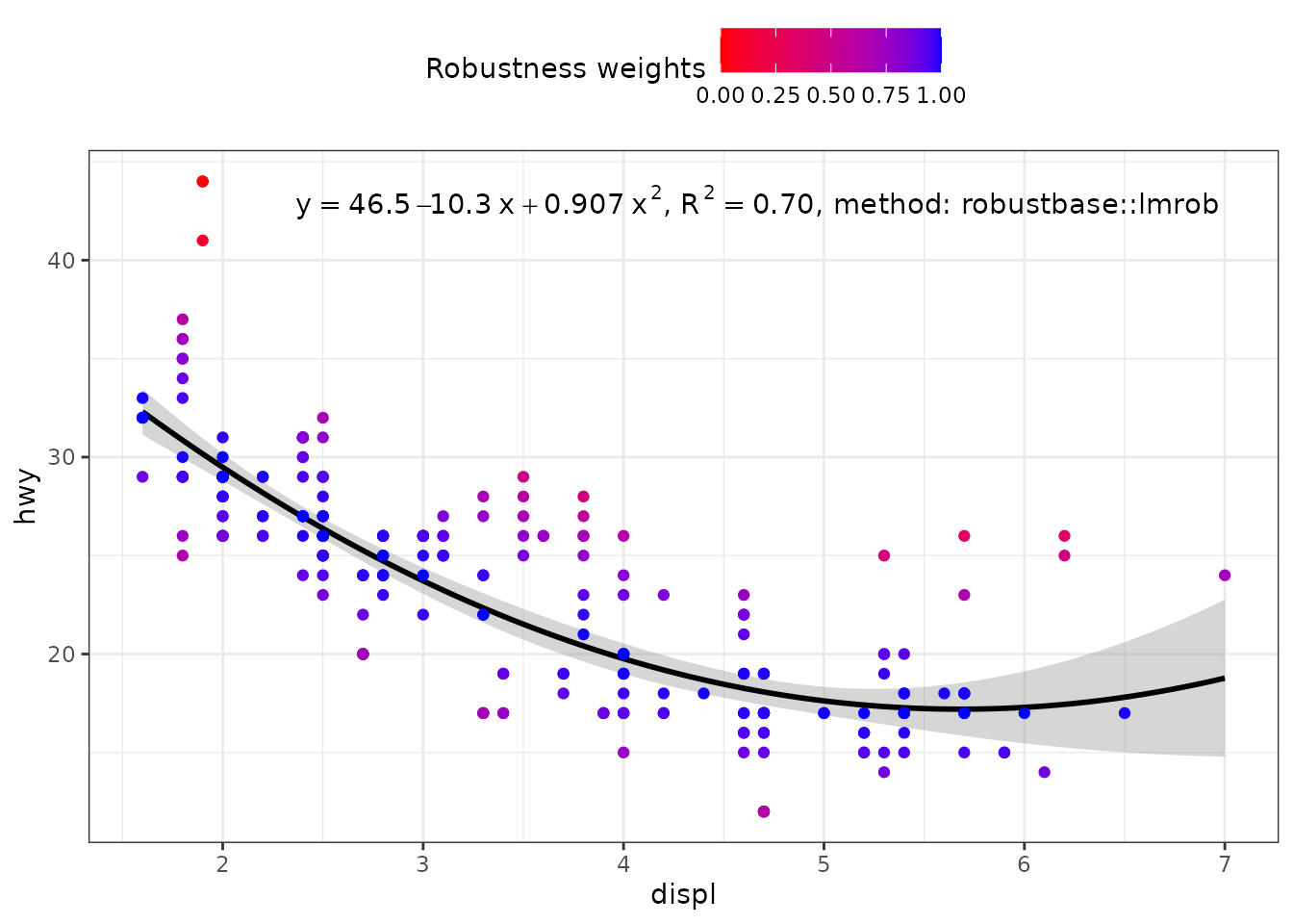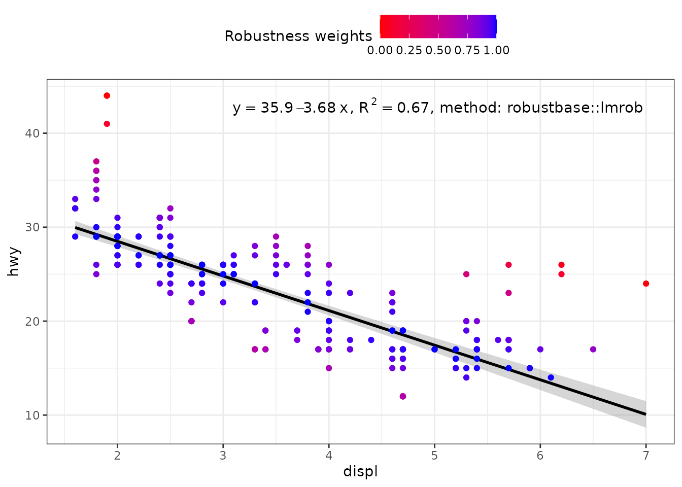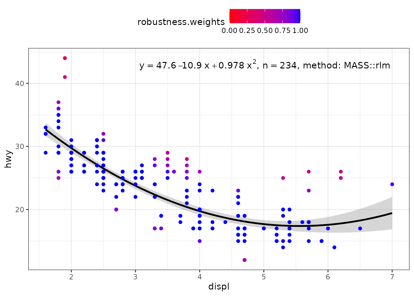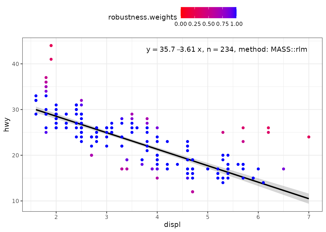 When weights are available, either supplied by the user, or computed as part of the fit, they are returned in data. Having weights available allows encoding them using colour. We here use a robust regression fit with MASS::rlm().