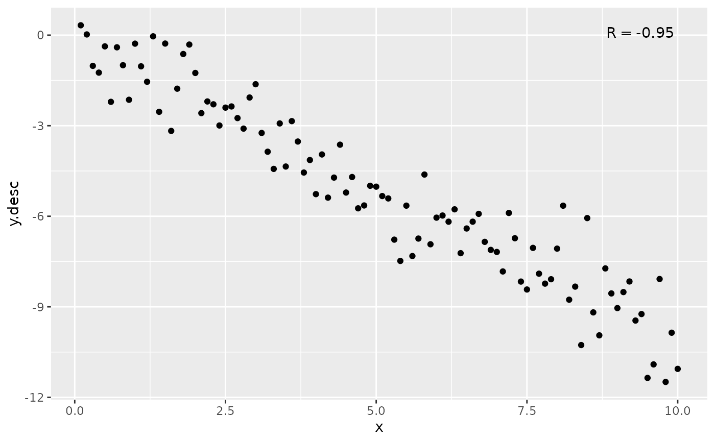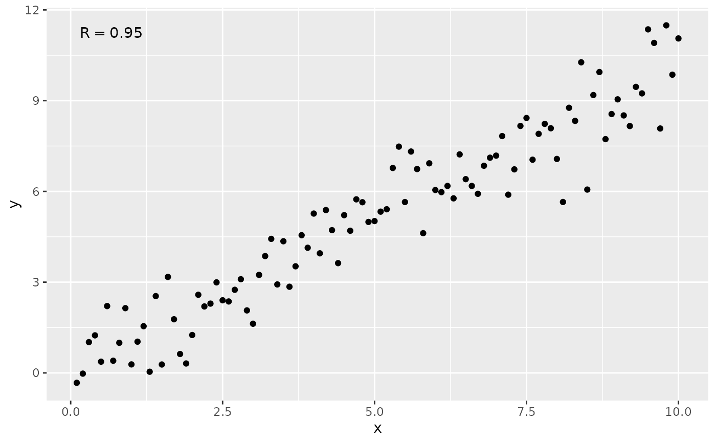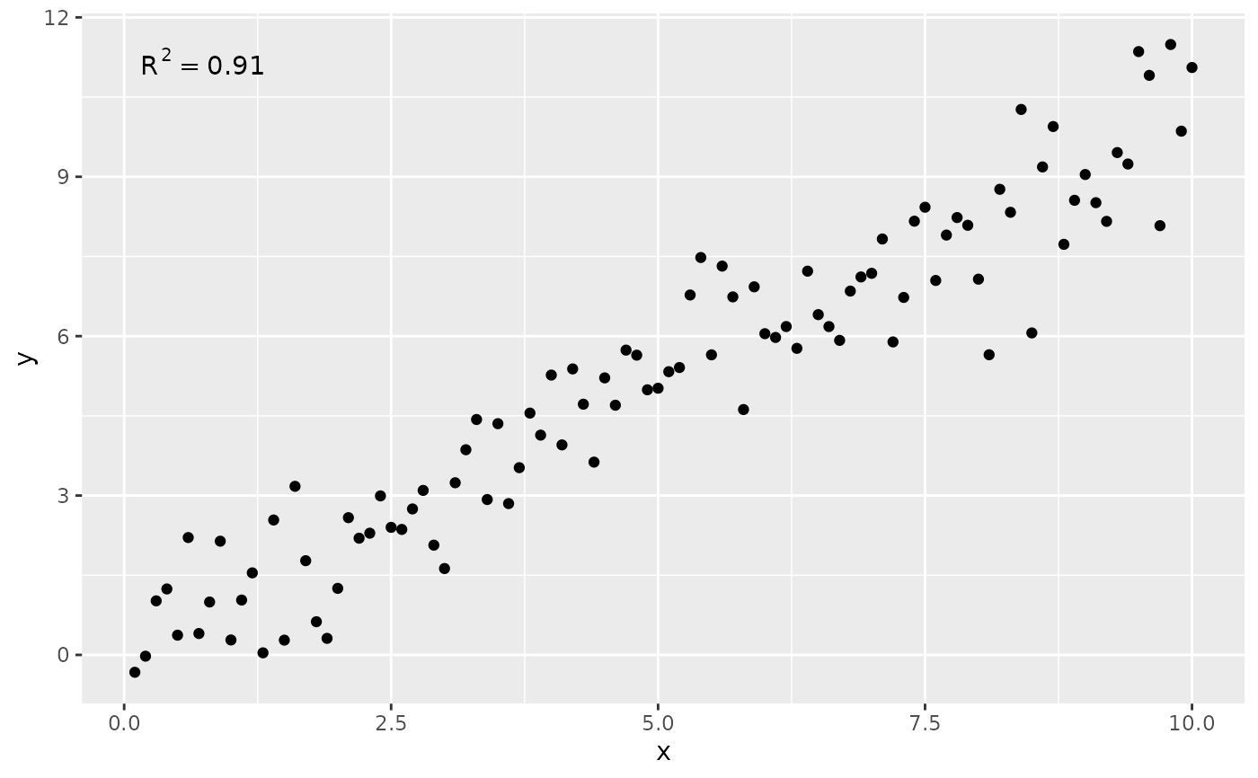 #> 1 "method: pearson" italic(R)~`=`~"0.95" italic(R)^2~`=`~"0.91"