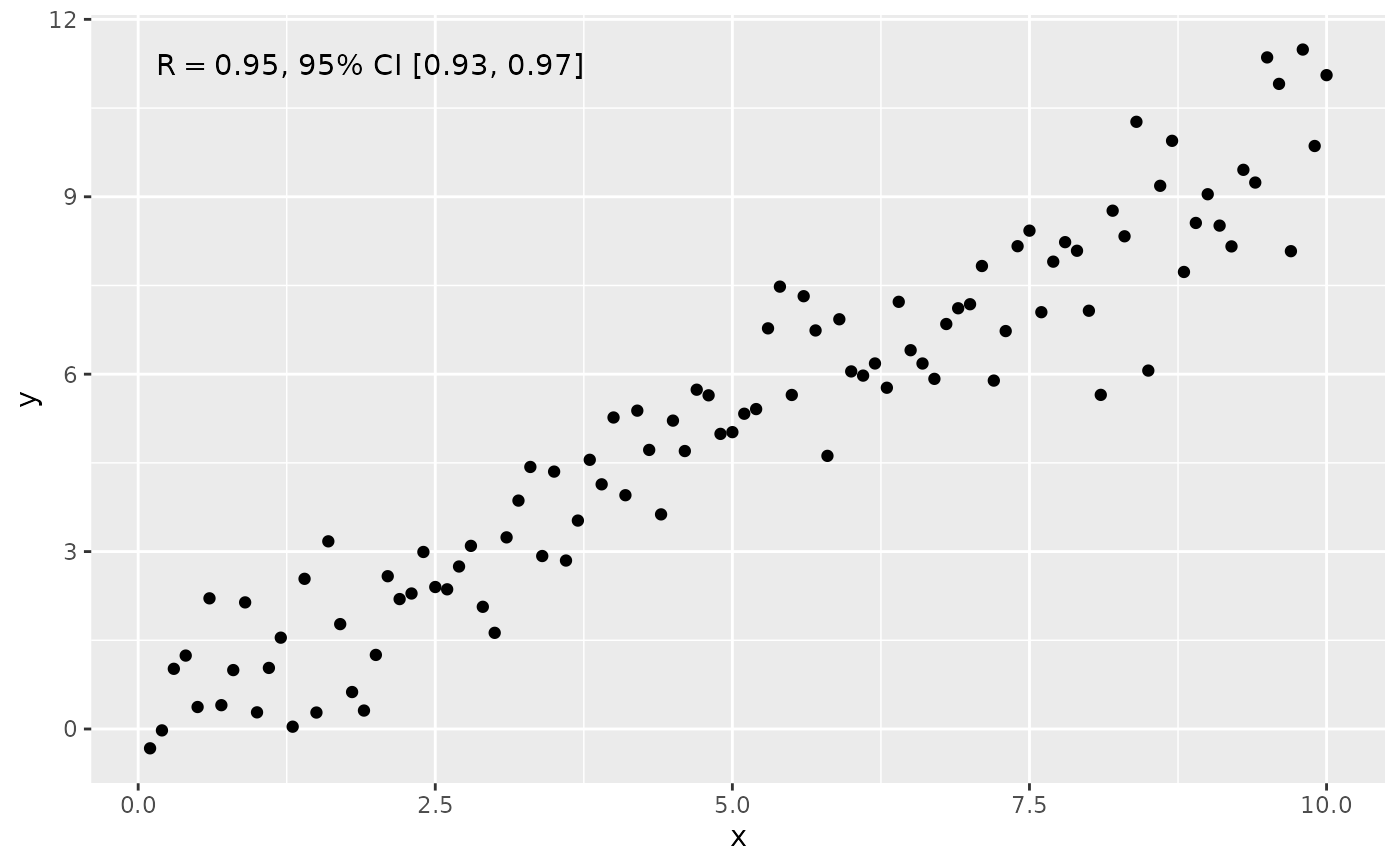 #> 1 italic(n)~`=`~100 -1 italic(R)~`=`~"0.95" "95% CI [0.93, 0.97]"