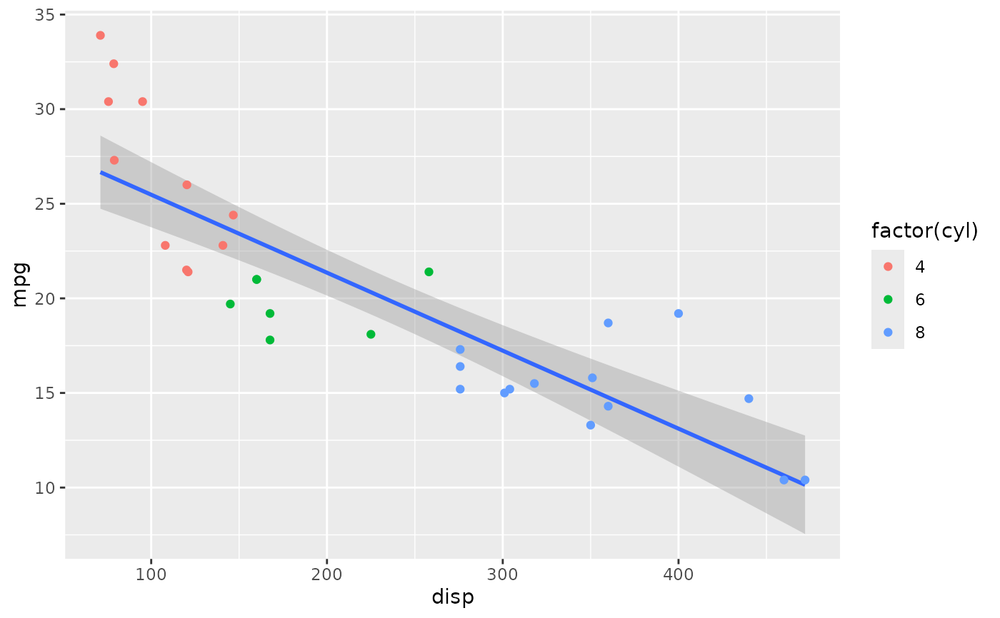 ggplot(mtcars, aes(x = disp, y = mpg, colour = factor(cyl))) +