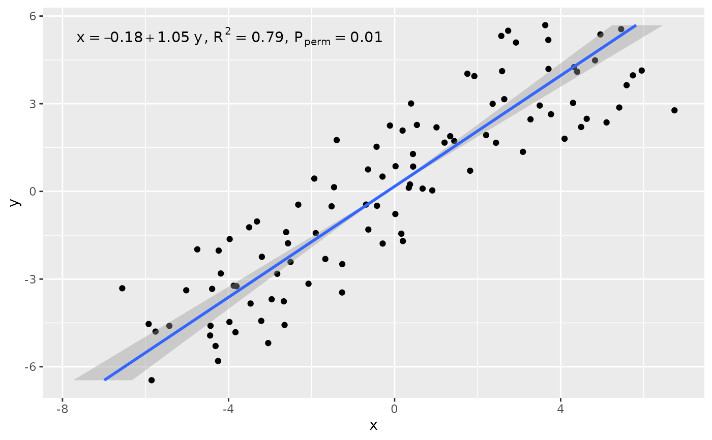 #> 1 italic(n)~`=`~100 -1 "method: lmodel2:MA" 0.7917998 6.665222 0.01