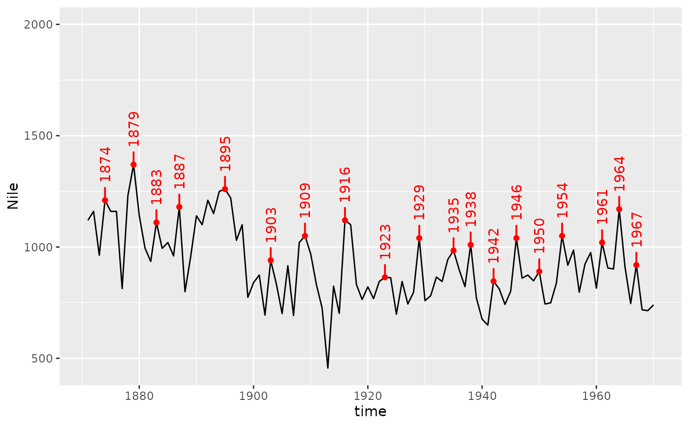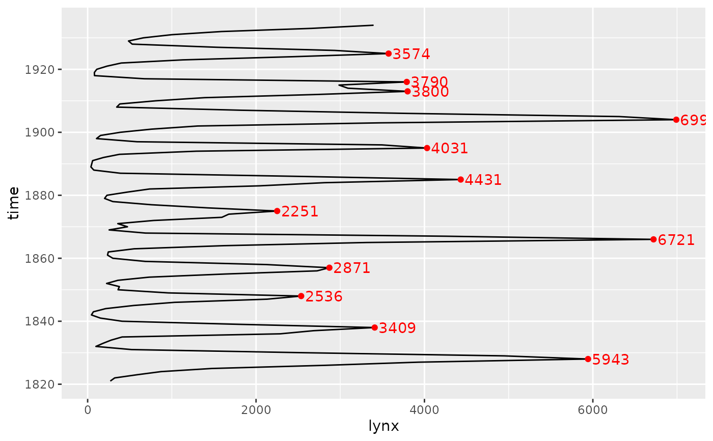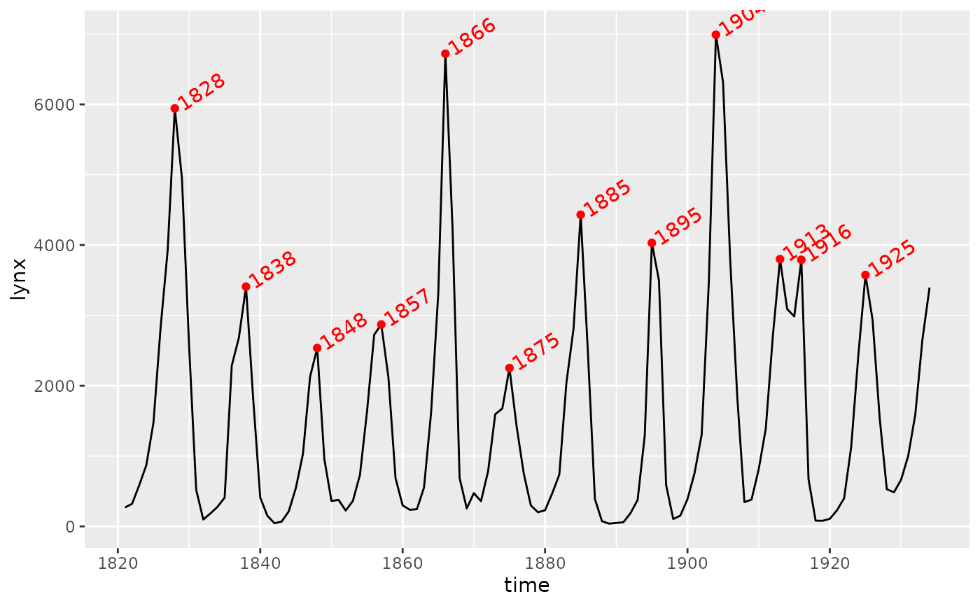 stat_peaks(colour = "red", geom = "text", hjust = -0.1, angle = 33)