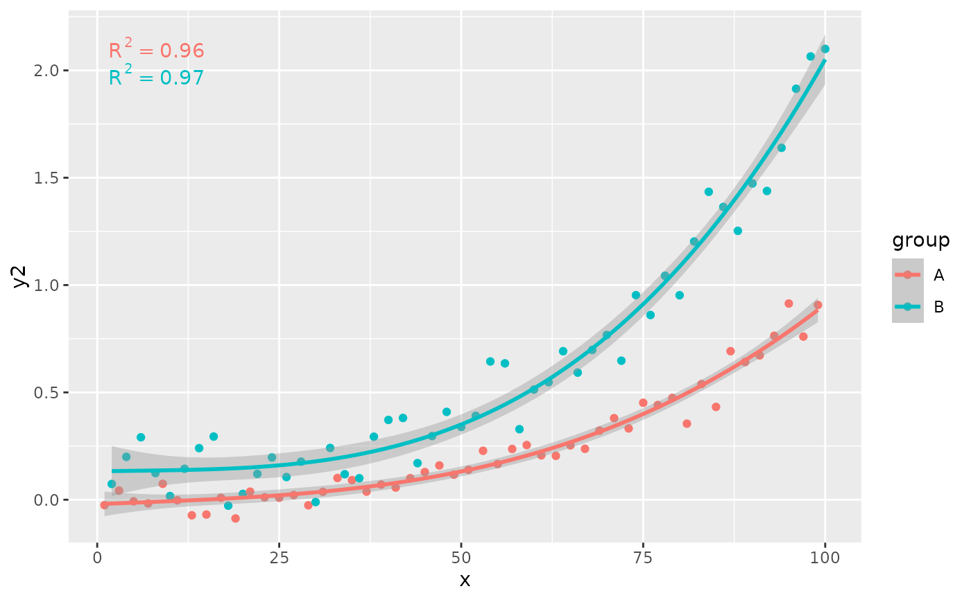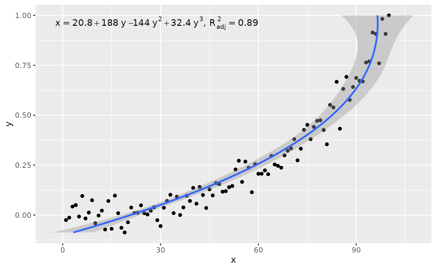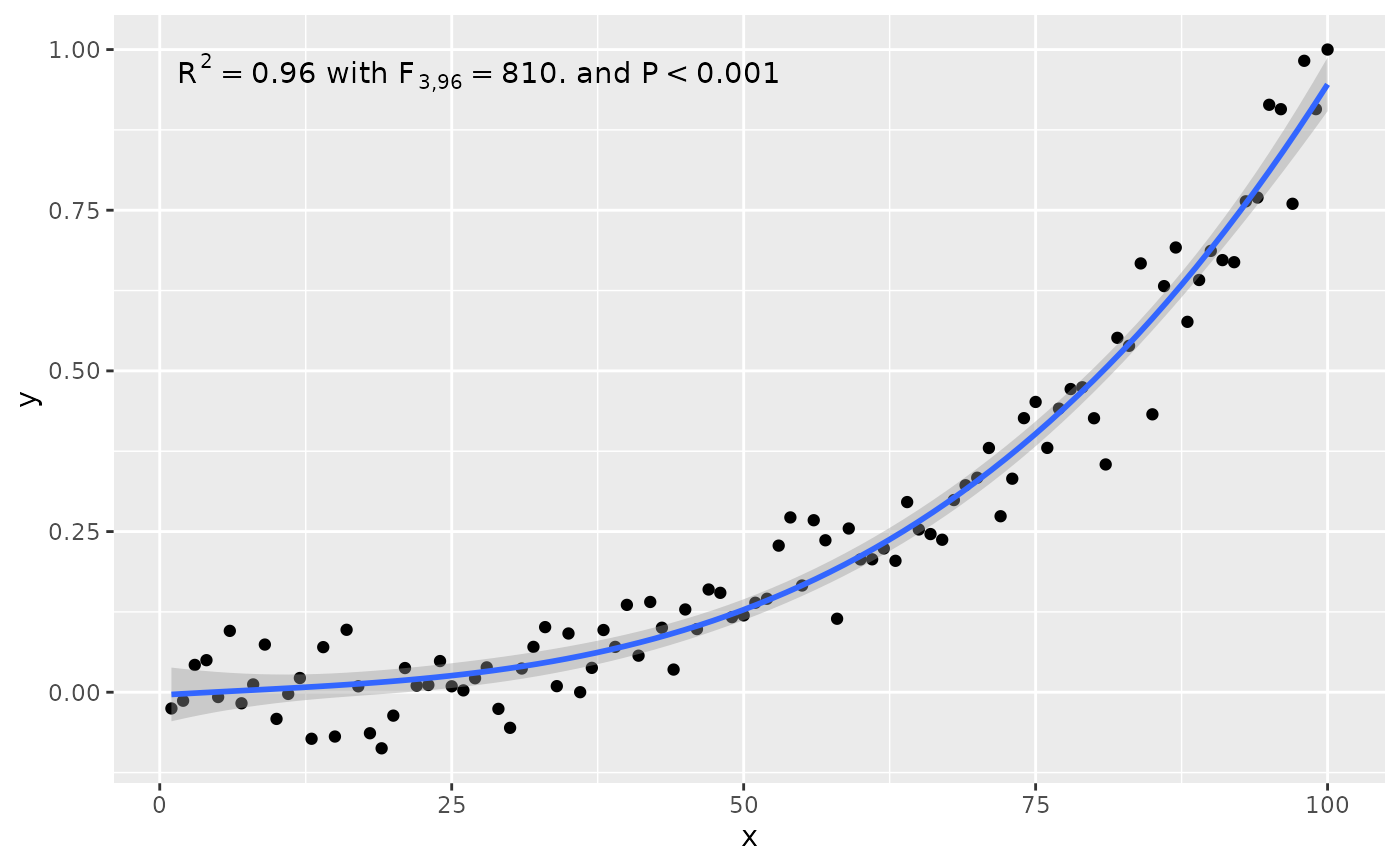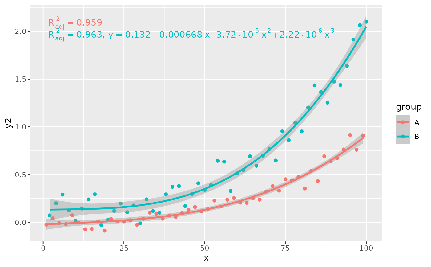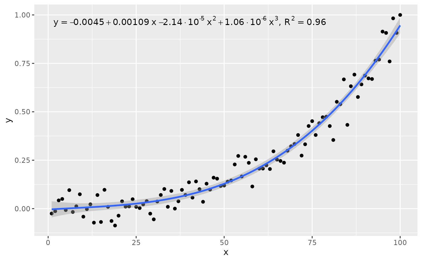 #> 1 y = -0.00450 + 0.00109 x - 2.14 10^-05 x^2 + 1.06 10^-06 x^3 R^2 = 0.96