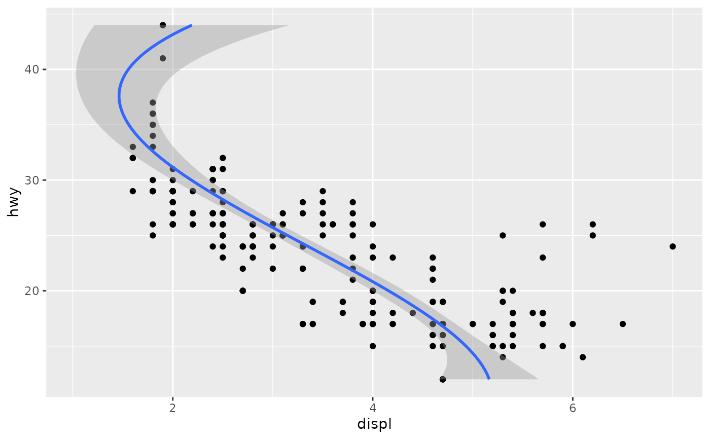 ggplot(mpg, aes(displ, hwy, colour = class)) +